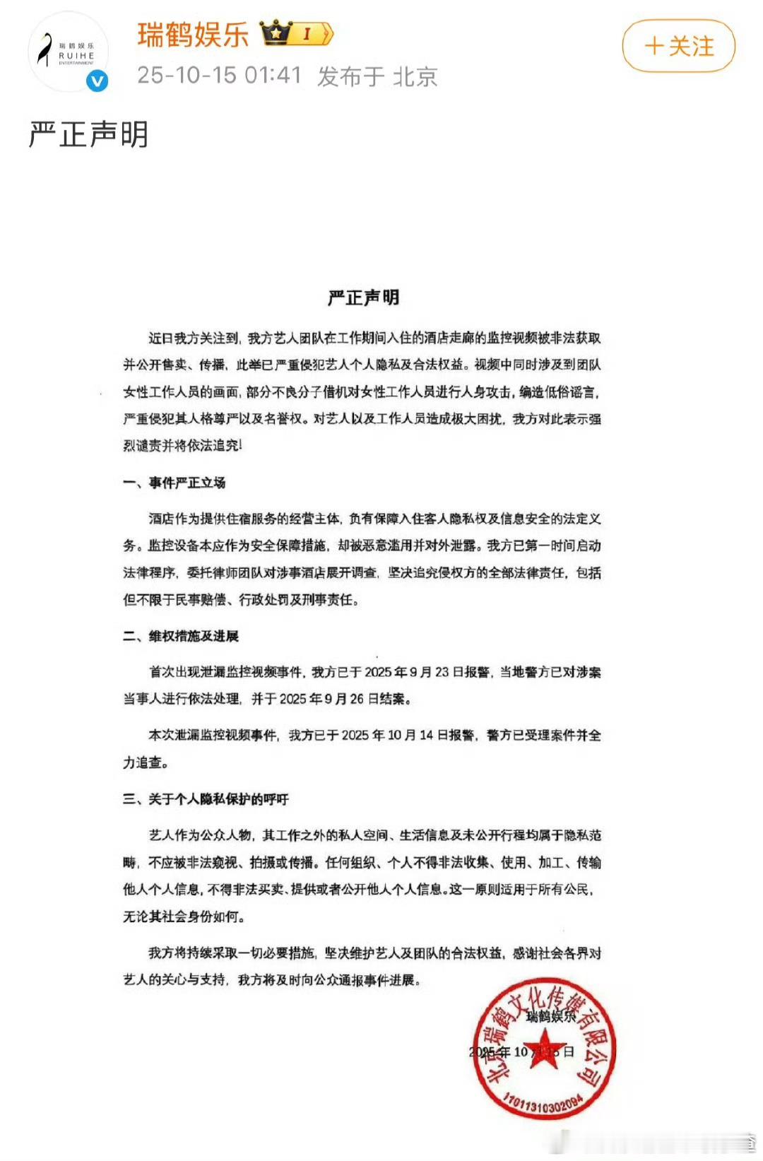梓渝酒店瑞鹤娱乐严正声明:酒店走廊的监控视频被非法获取并公开售实、传播,这对艺人以及工作人员造成极大困扰。此举已严重侵犯艺人个人隐私及合法权益。已第一时间启动法律程序,委托律师团队对涉事酒店展开调查,坚决追究侵权方的全部法律责任,包括但不限于民事赔偿、行政处罚及刑事责任。