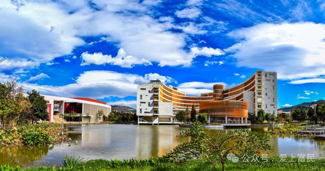 早安,富民 | 昆明行知中学:在水一方,思想启航 昆明行知中学里,澄澈的湖水静静环绕,似温柔的臂弯将图书馆拥入怀中,水面如镜,倒映着图书馆独特又富有设计感的建筑轮廓,还有那澄澈蓝天与朵朵白云,光影交错,如梦似幻。四周绿植繁茂,草木的清新气息弥漫在空气中,为校园增添生机与灵动。 在如此优美的环境里,学生们能于清幽雅致中,沉浸于知识的海洋,享受着得天独厚的教育氛围。