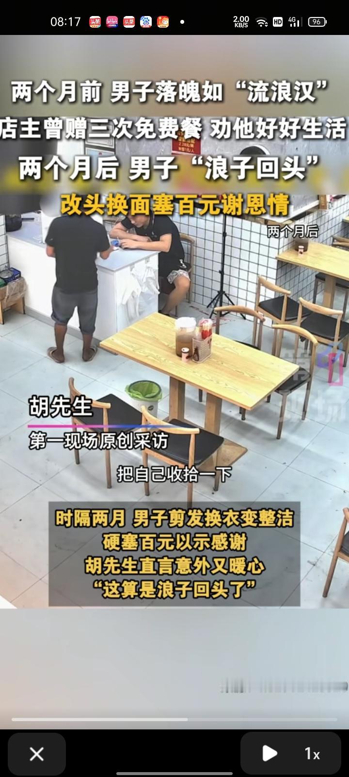 10月14日,广东广州。此前多次给衣着邋遢的男子提供免费餐,还劝他收拾自己找份工作,找个女朋友。时隔两个月,男子剪发换衣变整洁,硬塞百元以示感谢,直言意外又暖心,这算是浪子回头了。这一生会遇到很多人,秉持善意温暖他人,也同样温暖了自己,希望我们会越来越好。