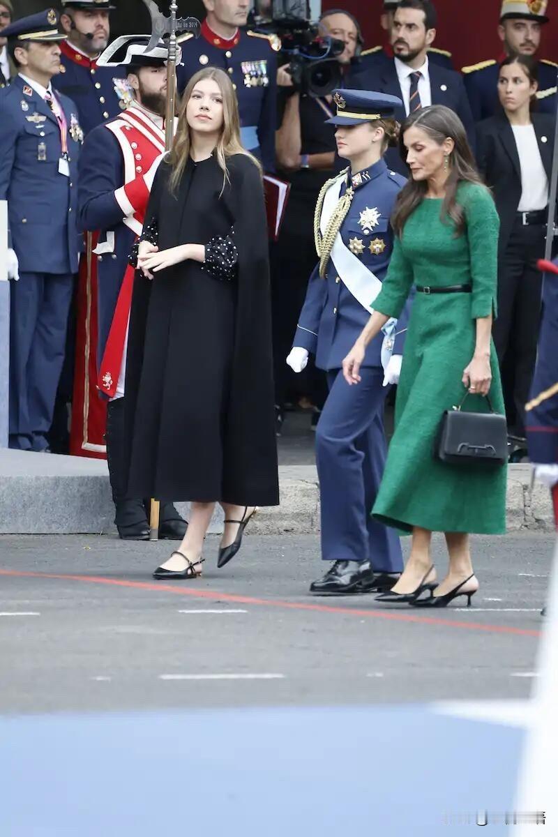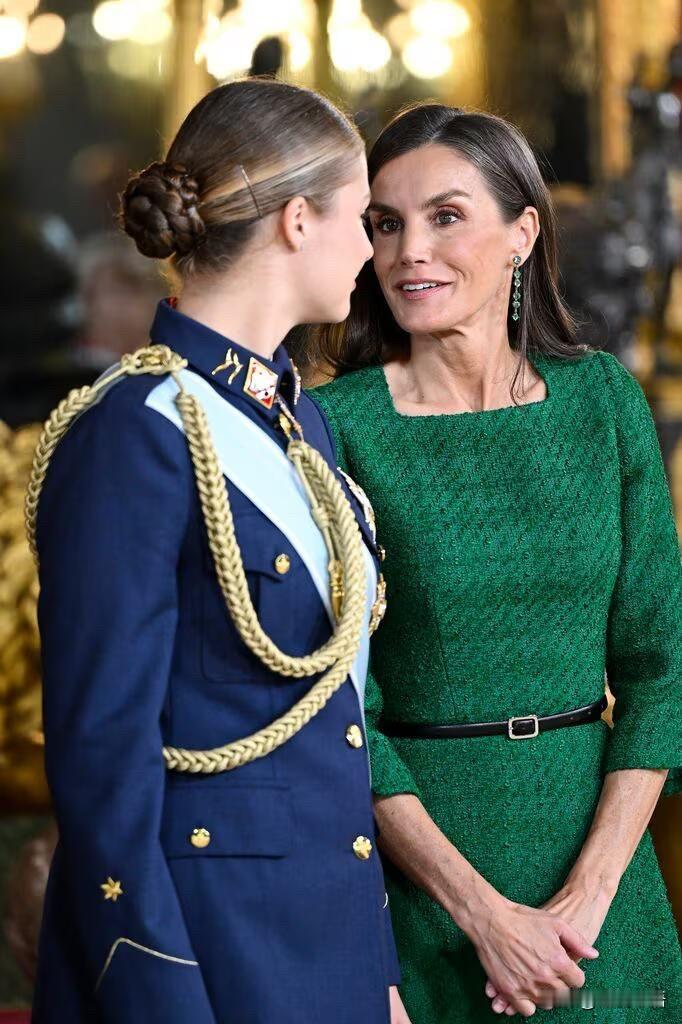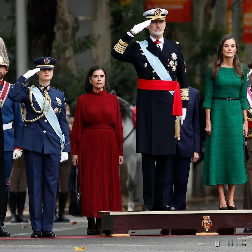 谁还没被西班牙公主帅到! 板鸭国庆日这波赢麻了 莱昂诺尔公主穿新空军制服亮相, 那叫一个英姿飒爽! 肩章闪着光, 配上勋章直接气场拉满 金羊毛、卡洛斯三世、还有俩大十字勋章,妥妥的王室门面排面! 王后和公主温柔敛衽微颔, 这边王储直接昂首敬军礼, 一柔一刚反差感绝了, 谁看了不说句“未来女王范儿”! 这颜值这气质, 果然王室培养的格局不一样, 越来越有女王气质了! 西班牙王室