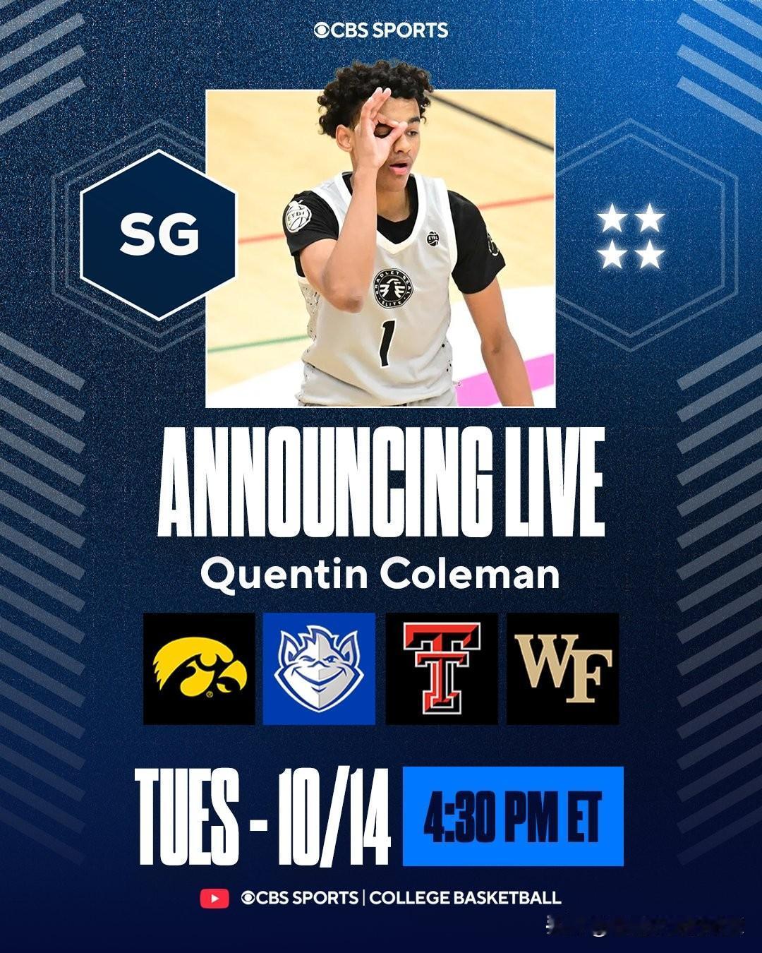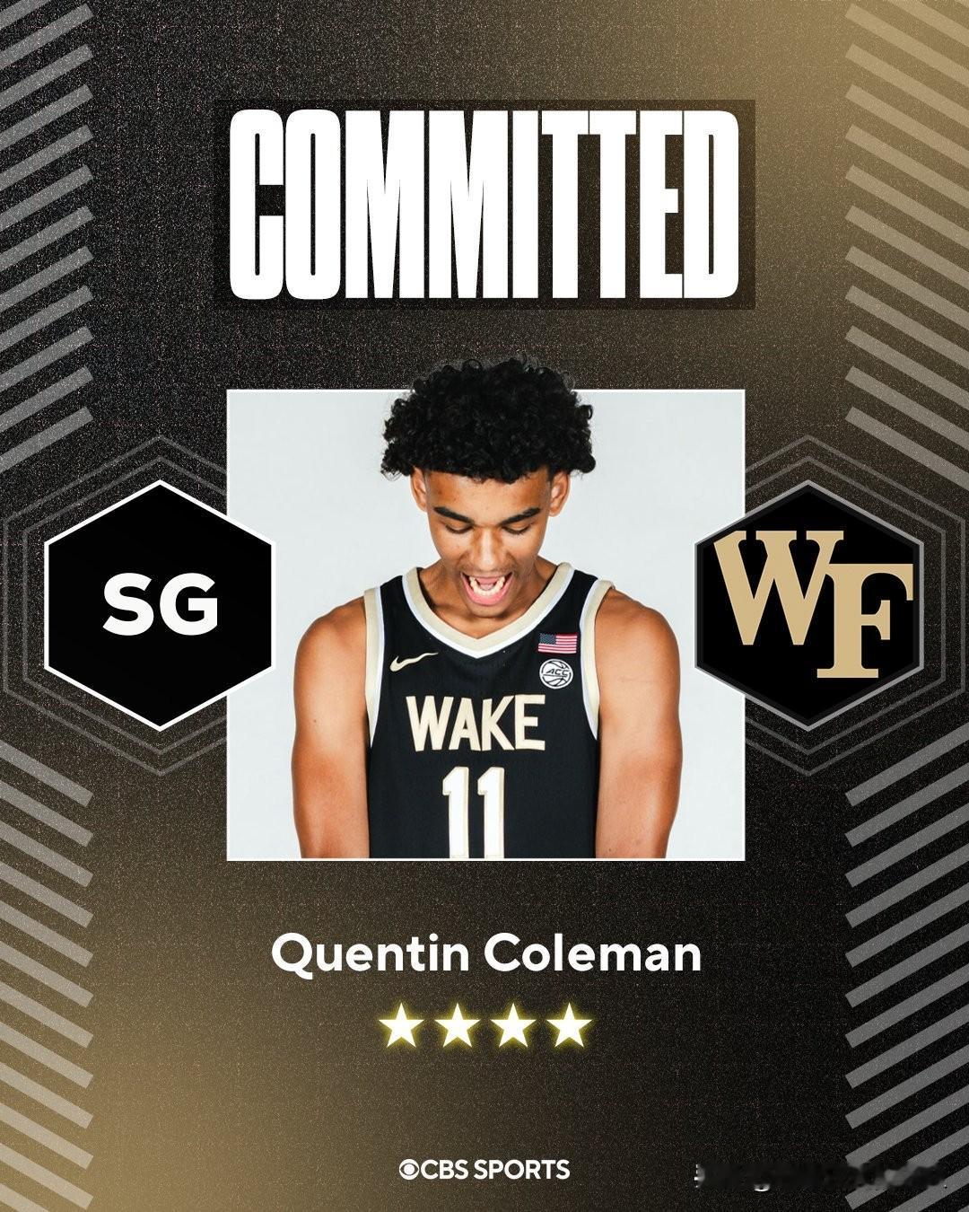 四星后卫Quentin Coleman宣布承诺NCAA男篮 维克森林,高中就读于密苏里州Principia,身高6-3=191,选择这里不仅是因为教练还有球员,我可以和他们一起度过一些美好的时光。球队这届收到的第三位加盟者,之前还有双胞胎前锋Gavin Placide与Gallagher Placide。