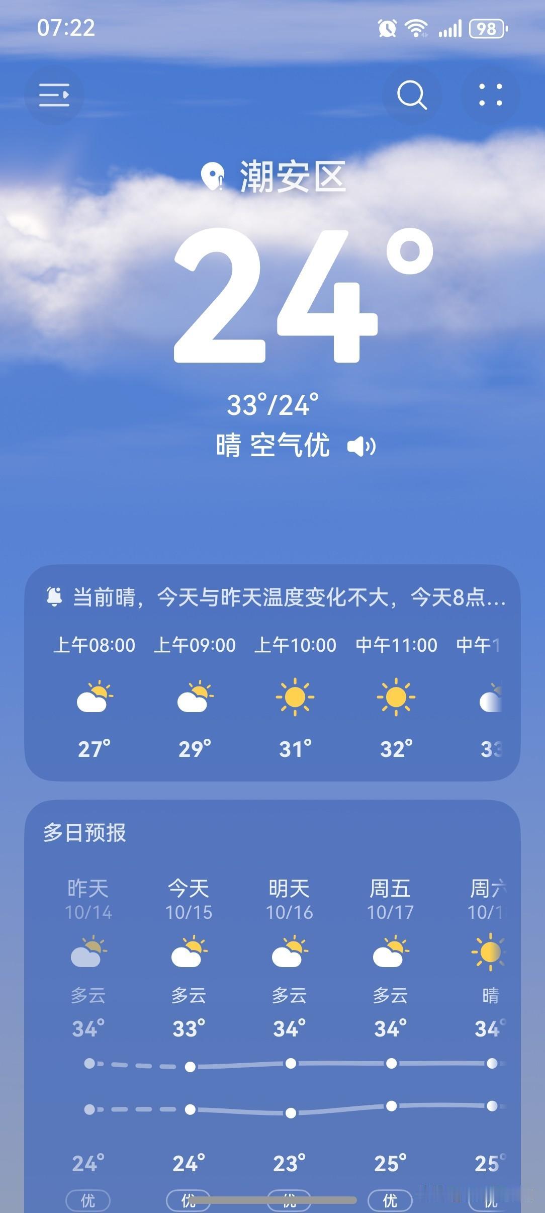 秋老虎继续发威, 广东雷雨渐少热力不减! 天气持续炎热, 19日或有望迎来清凉, 好期待呀~ 今天(15日), 潮州喜提一个多云天气, 气温24~33℃, 此刻气温24℃, 全天最高气温33℃, 比昨天略降1℃, 依然是热热热! 看看今天的天空, 又是高温暴晒的一天! 本来昨晚就没睡好, 眼睛有点睁不开, 被这耀眼的阳光一晒, 更加睁不开眼了! 嘿嘿~ 太阳对着我贴脸开大, 那我就闭眼装瞎吧! 生活中亦是如此! 对于那些看不惯的人或事, 直接无视就好了! “与你何干?” “与我何干?” 只要记住以上两句话, 便可活得洒脱自在~ [笑哭][笑哭][笑哭][笑哭][笑哭][笑哭][笑哭][笑哭]