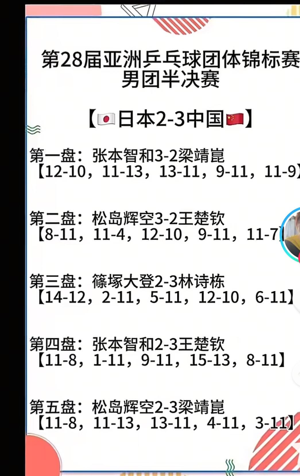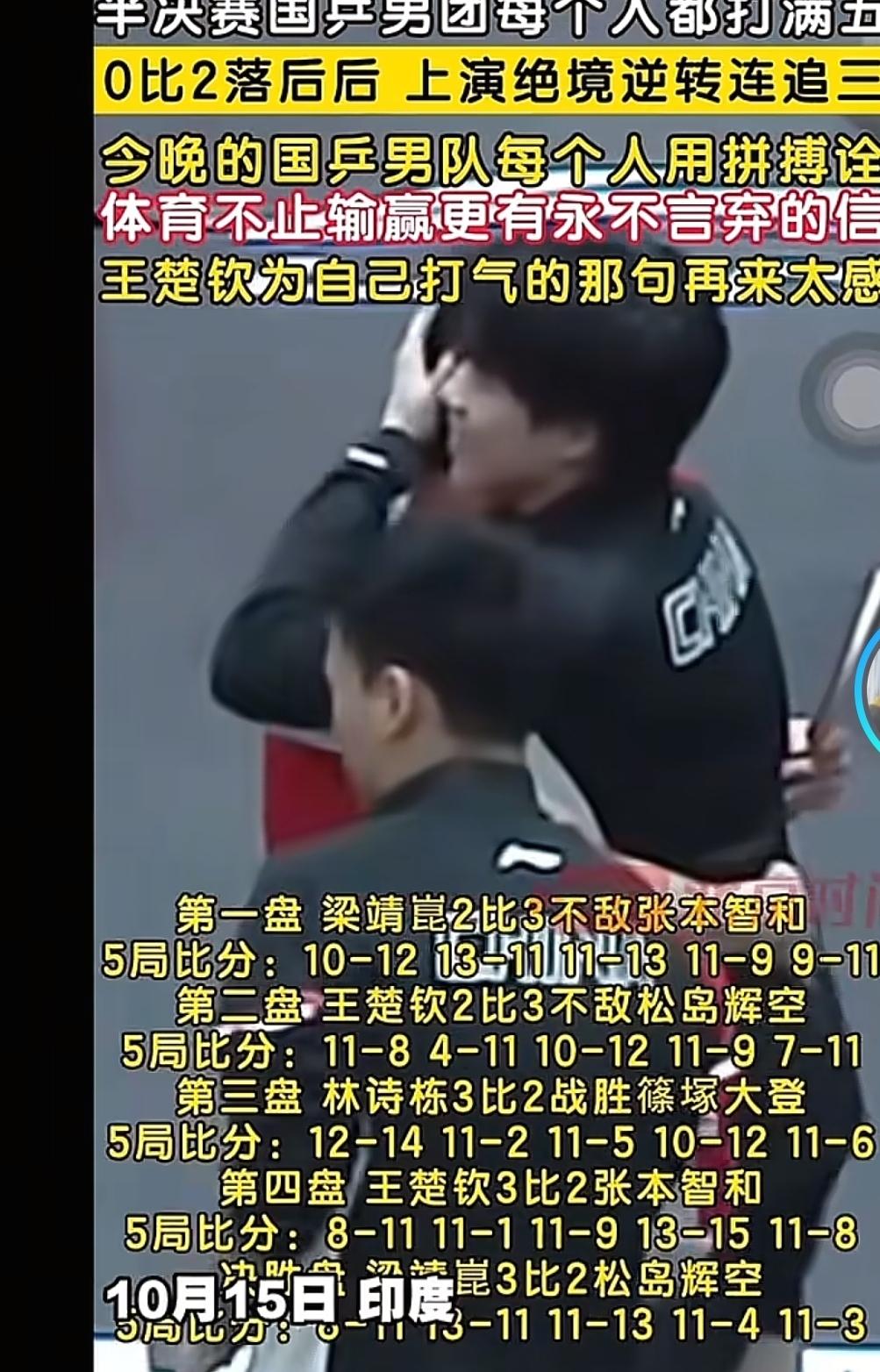 此时此刻,团魂炸裂, 他们用信念再次把不可能变成了可能, 亚锦赛半决赛,中国队和日本队的较量, 这是一场无论如何不能输的战争, 前两盘梁靖崑和王楚钦却先后失利, 中国队大比分2:0落后。 日本队只要再拿下一局便可获胜, 而中国队将不得不止步四强。 使命感,责任感,不能输的信念在每一个人身上得到具象化, 五盘,二十五局, 他们整整打满了二十五局,(比分见下图) 每一分都不容易, 每一拍都不容易。 王楚钦为自己打气的那句再来,看哭了多少人? 梁靖崑最后一分拿下那一刻的泪水, 又有多少人破防了? 去年因为自己丢分而怯怯的不敢摸奖杯的他, 今年完成了自我救赎。 他们打的不是球, 是荣誉,是不能输的信念, 他们做到了, 这场景和去年樊振东对阵张本智和的那场半决赛何其相似, 看的惊心动魄, 看的心惊肉跳, 所幸。他们活过来了。