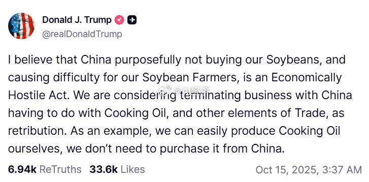 特朗普:“我认为,中国故意不购买美国的大豆,给我们的大豆种植户造成困难,是一种经济敌对行为。作为报复,我们正在考虑终止与中国在食用油及其他贸易领域的业务往来。例如,我们自己可以轻松生产食用油,无需从中国购买。”