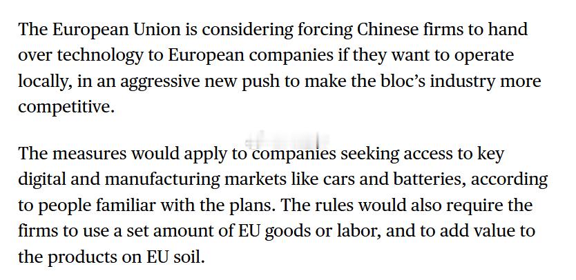 彭博:欧盟正考虑强制要求在成员国运营的中国企业移交技术,将包括汽车和电池等关键数字和制造业企业。欧盟还将要求这些企业使用一定数量的欧盟商品或劳动力,并在欧盟境内为产品增值。加强合资是另一个选项。