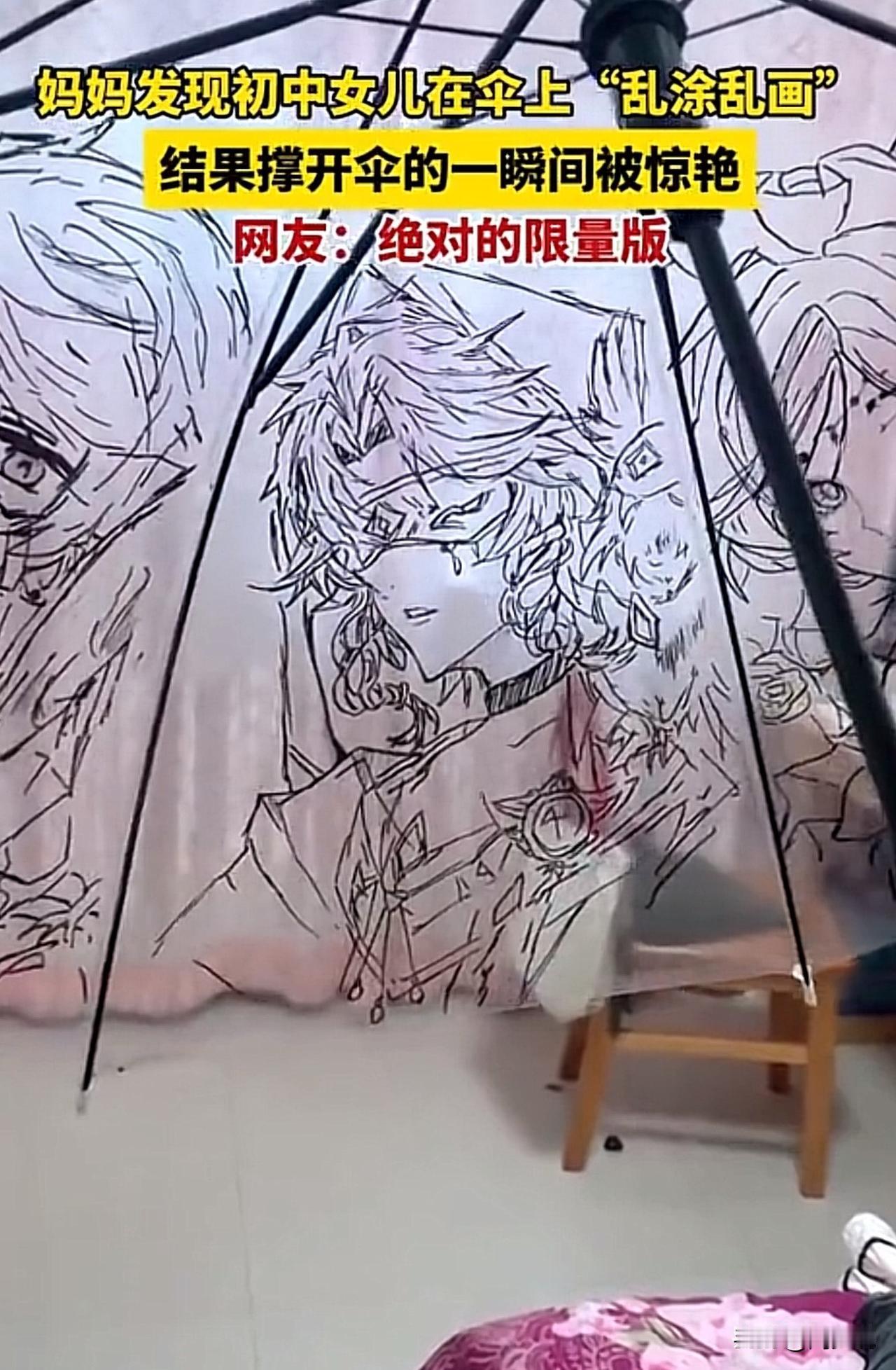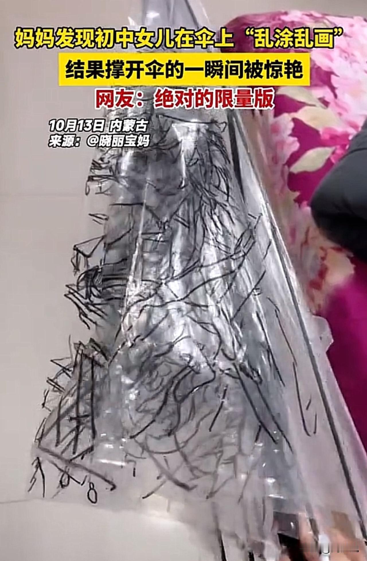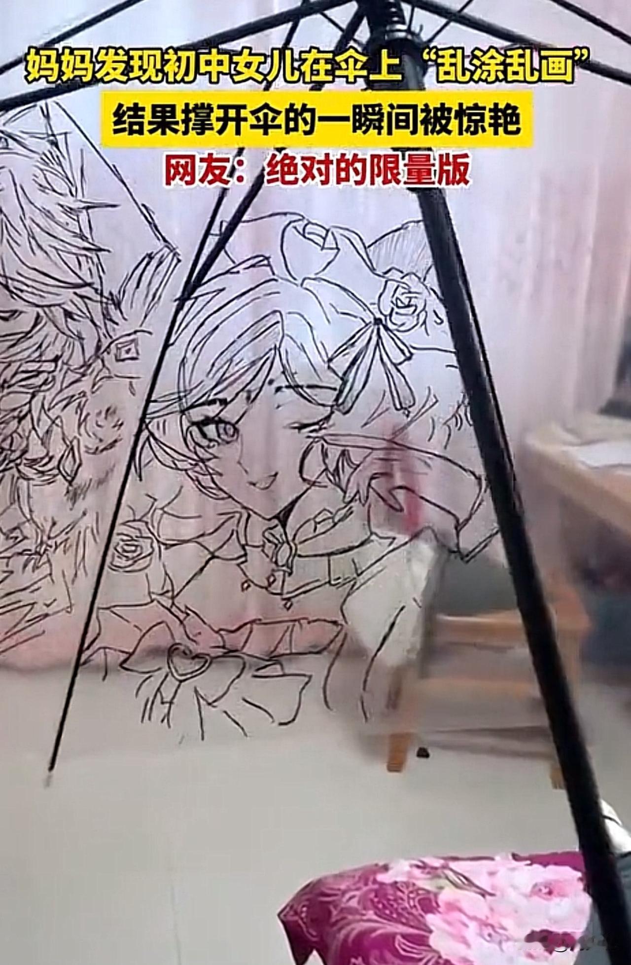 #女孩在伞上画画撑开伞的瞬间被惊艳#“真是太有才了!”一位初中女孩在雨伞上“乱