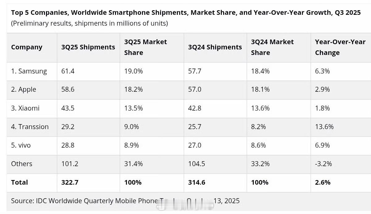 小米 2025年第三季度的全球智能手机市场,根据 IDC 最新发布的数据,全球智能手机出货量排名前五的品牌依次为:三星、苹果、小米、传音和vivo,其中小米位列第三。