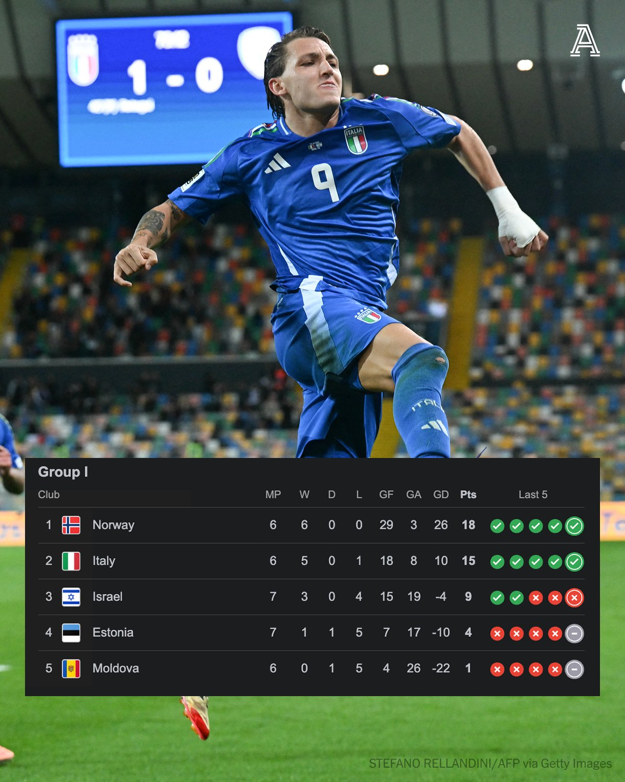 世预赛欧洲区小组赛I组第8轮,意大利主场3比0战胜以色列,6战5胜1负积15分,落后榜首挪威3分。