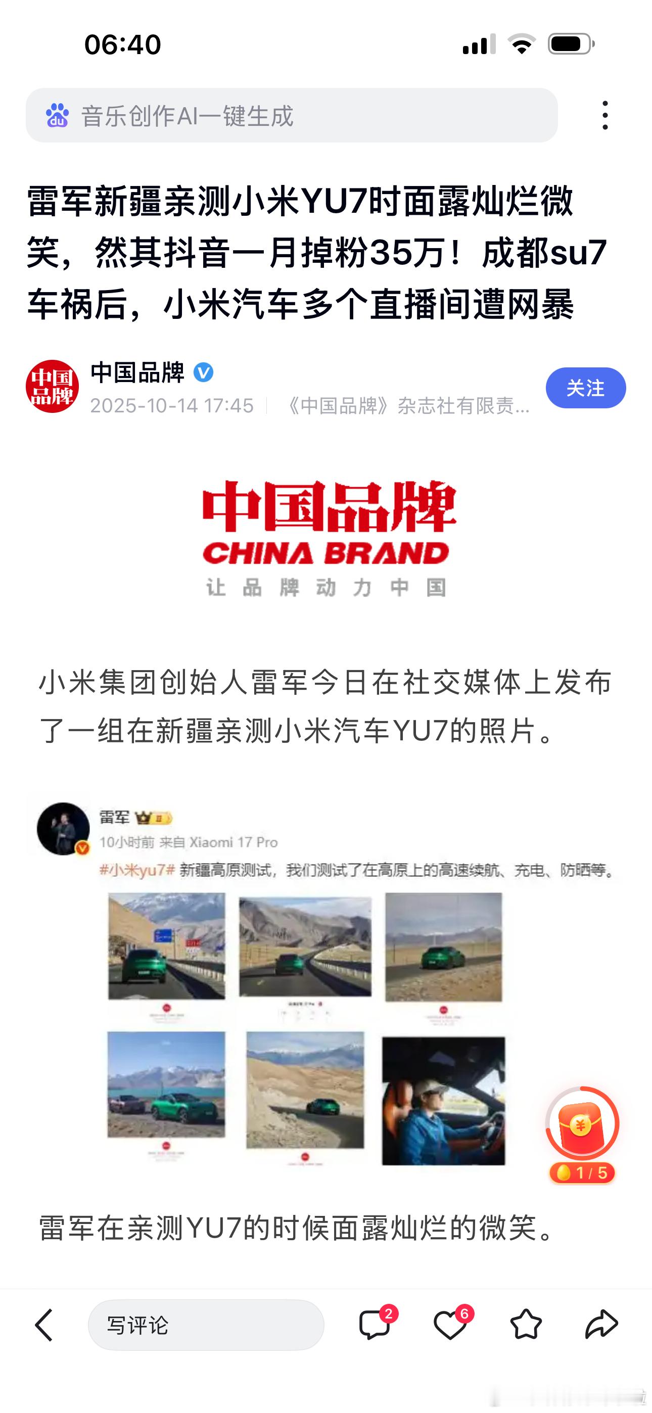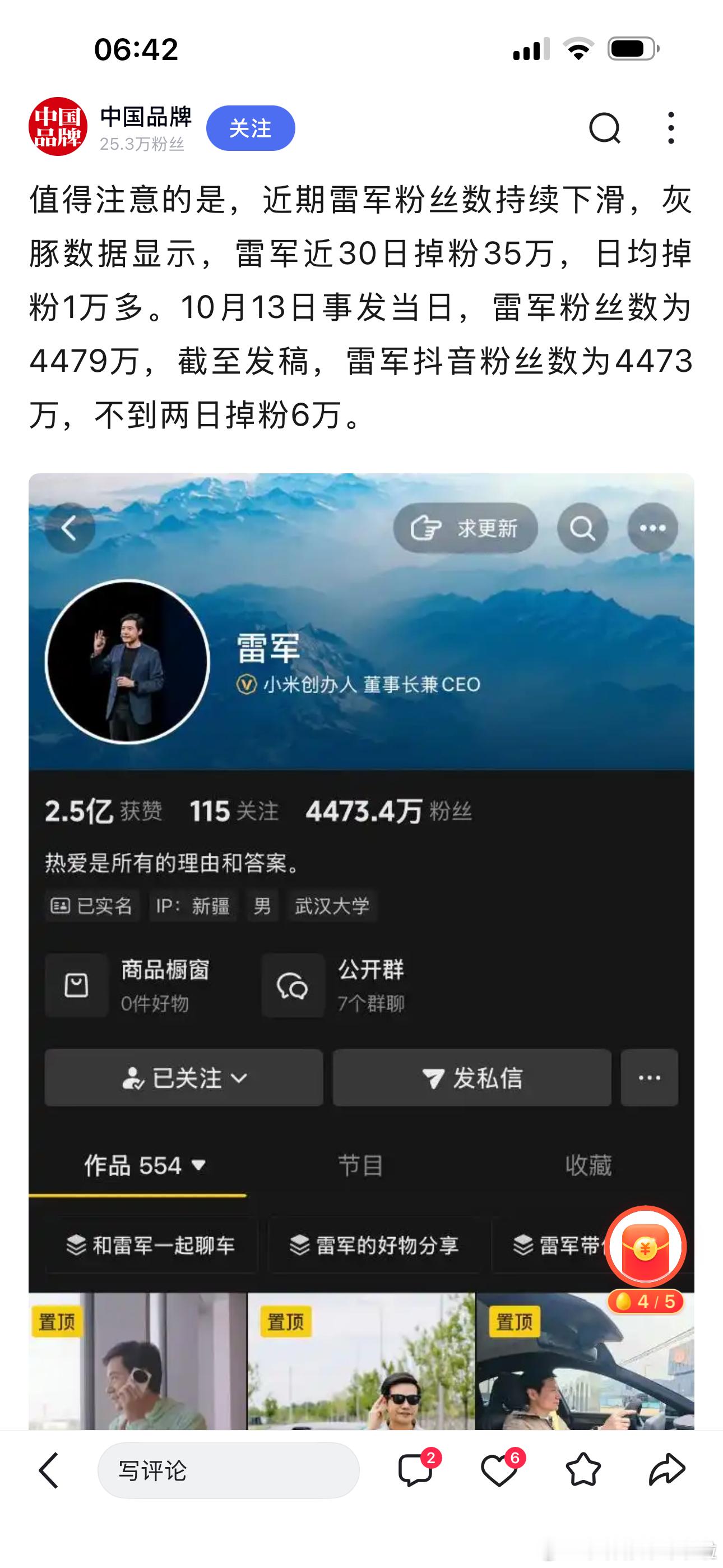 据媒体报道,雷军 抖音正在持续掉粉雷军[超话]小米汽车成都天府大道小米自燃青蛙养殖交流基地[超话]小米汽车[超话]