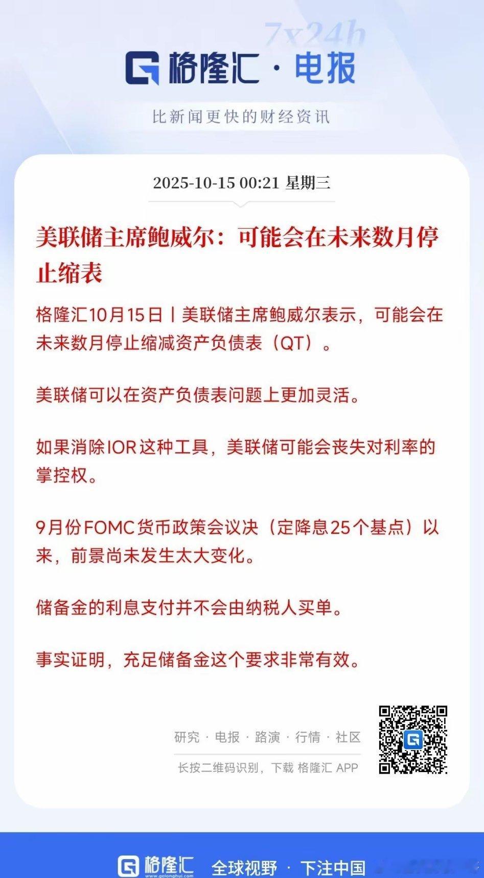 鲍威尔表示可能会停止缩表,9月份降息以来,经济前景没有太大变化,储备金利息不会让纳税人买单。