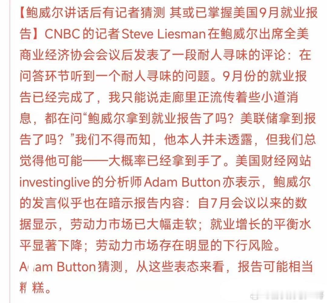 虽然美国政府还处于停摆阶段,但是有人猜测鲍威尔已经拿到了劳动力市场的关键数据,不难看出,劳动力市场的数据还是不及预期。
