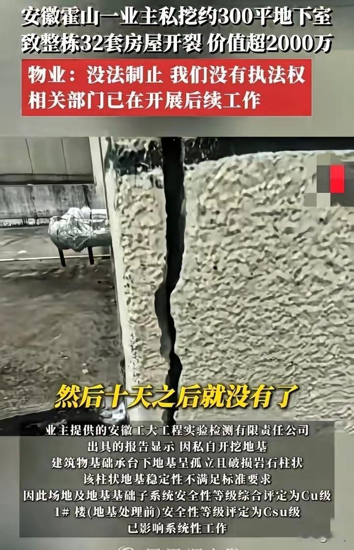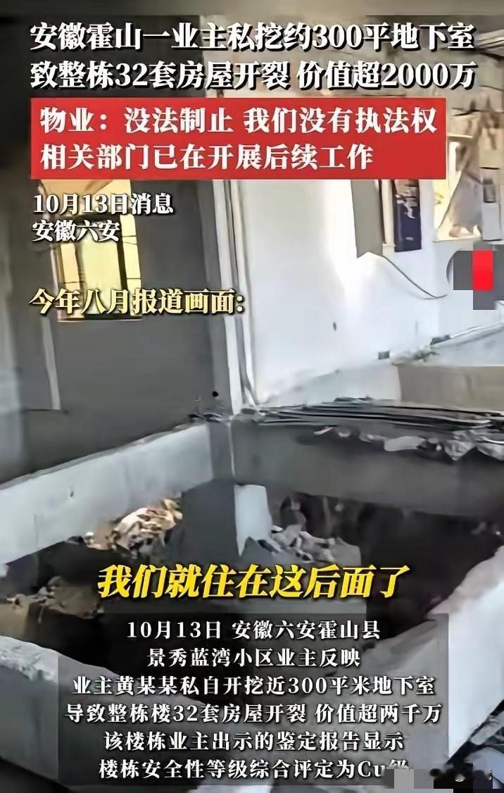 人在家中坐,祸从邻居来! 安徽霍山县景秀蓝湾的黄某,他私挖的300平方米地下室,不仅让自家房屋成了危房,更让整栋楼的32户邻居被迫搬离,2000万的房产价值一夜蒸发。这场闹剧背后,暴露的不仅是个人道德的缺失,更是对公共安全规则的漠视。 他对建筑常识的彻底无视,挖穿地基承台、破坏楼体结构,甚至在外墙开裂后仍继续装修,这种盲目自信堪比“掩耳盗铃”。更讽刺的是,他以为用3米高的遮挡物就能掩盖违法行为,却不知挖机作业的震动、夜间运土的噪音早已引起邻居怀疑。这种“聪明反被聪明误”的操作,最终让整栋楼沦为“Cu级危房”。 黄某的“坏”,源于对利益的畸形追求。一套商品房的价格,却想通过挖地下室“增值”,这种贪婪的本质是侵占公共资源。而当他将个人便利凌驾于邻居安全之上时,损害的不仅是房屋价值,更是社区信任的基础。正如网友所言:“猪队友坑的是团队,坏邻居毁的是整个小区。” 事件曝光后,邻居们的维权之路却步履维艰。黄某无力赔偿,物业无权执法,最终只能依赖政府介入。这种“个人犯错,集体买单”的结局,暴露出社区治理的漏洞:为何物业缺乏执法权?为何违建行为未能被及时发现?更值得深思的是,若邻居们能早一步联合制止,悲剧或许不会如此惨烈。 霍山事件并非孤例。从北京“最牛违建”到杭州“挖穿地下室”,类似事件屡见不鲜。要避免“祸从邻居来”,既需完善监管机制,更需培养居民的公共意识。毕竟,一个健康的小区,不应靠运气避开“黄某”,而要靠规则与互助筑起防线。