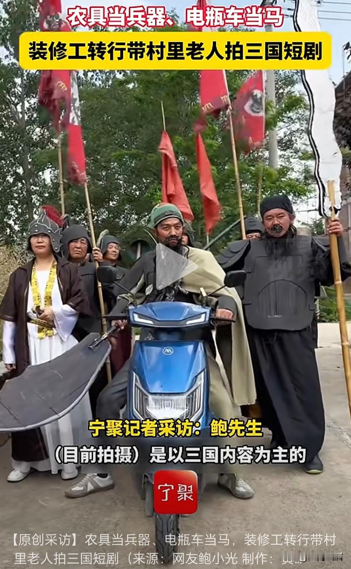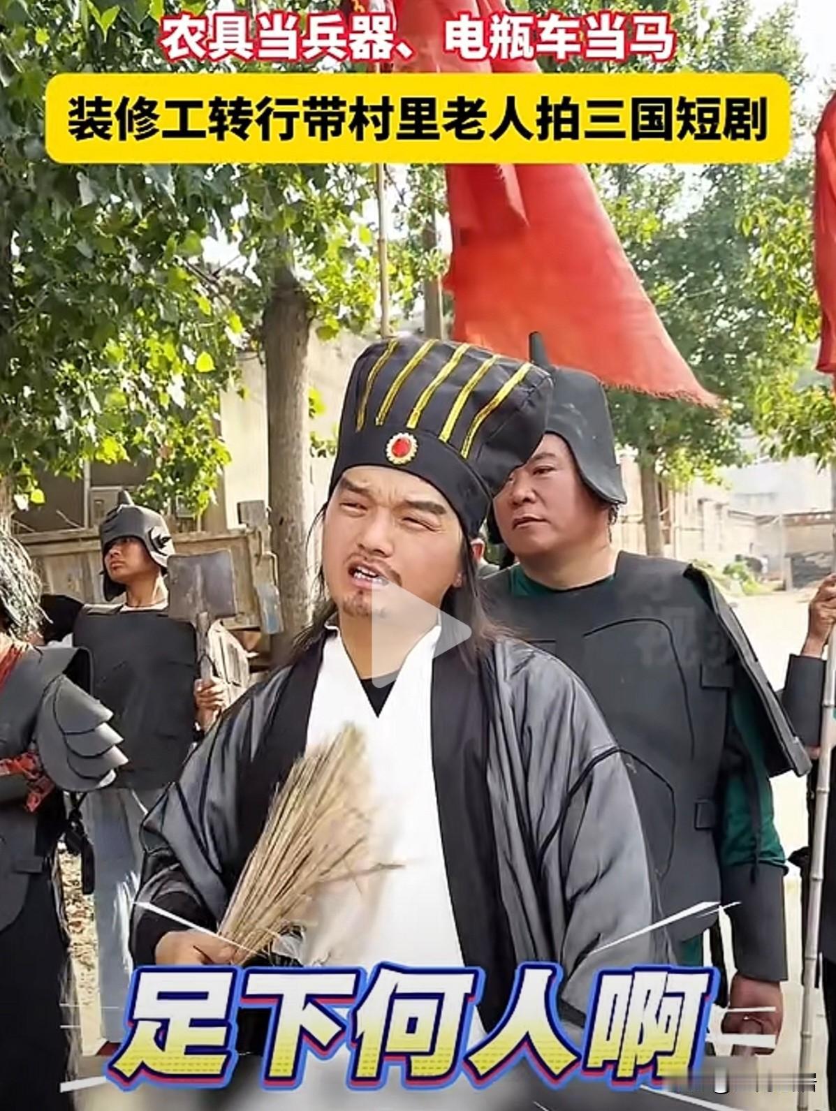 装修工人回村拍短剧,带领村里老人们拍三国剧情。他们用农具当兵器,电瓶车当战马。拍了一系列的土味三国短剧。这看起来,还是有模有样的。既能通过拍短剧,增加村里老人们的收入,也能为老人们的养老生活,增添乐趣。一举两得!