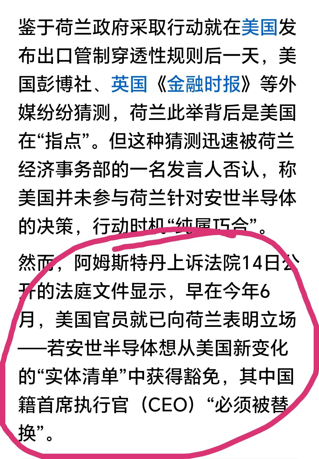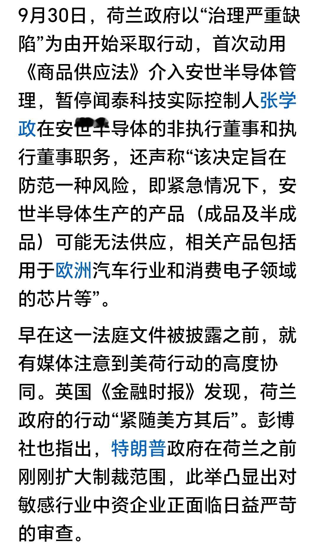 我们的反击来了。不过,荷兰猪的话没有错,安世半导体确实会给“荷兰和欧洲经济安全带来风险”。你看,6月份的时候美国佬就警告他们了,如果想要从美国的实体清单中被豁免,就必须换掉管理层的中国人。 你看,这是不是对荷兰和欧洲经济安全构成了风险,没有安世半导体,根本就不会有这个风险,对吧? 再看,中国商务部完全没有惯着,直接进行出口管制。安世半导体在中国生产的产品不准出口也不准卖。 你看,这是不是又是风险。 只是,你不在在故纸堆中寻找战时法令来耍流氓,第二个风险本来就不会有。第一个,如果你不和美国走那么近,这个风险本来也不会有。 归根到底,你们的风险在于和西大走得太近被压榨却想在东大这里占便宜。 这,怎么可能呢? 顺便说一句,之前有些沙茶还认为我说这件事又是美国背后捣鬼是在污蔑美国给美国泼脏水,现在看看冤枉他没有? 点右上角关注我,我们一起去看这个魔幻的世界