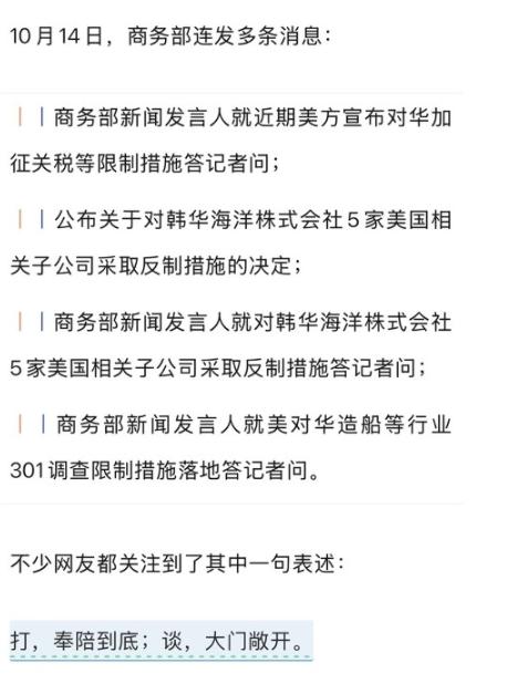 中方一天内4次重磅声明,一句话让美方彻底破防:这次真的有大麻烦了。 中方这波操作算是彻底把态度摆明了,10 月 14 号一天之内连抛四次重磅声明,全是冲着美方的贸易打压来的,每一条都戳在要害上,尤其是那句翻过来的老话,直接让美方有点扛不住了。 要说清楚这事儿的来龙去脉,得先看美方是怎么步步紧逼的。美东时间 10 月 14 号那天,美国刚依据所谓的 301 调查结果,正式对中国的海事、物流和造船领域下了手,搞起了港口费限制那套。 这还不算完,之前就一直放风要对华加征 100% 的关税,一边喊着要通话谈,一边又拿制裁当筹码,典型的边打边讹诈。美方这边刚亮完肌肉,中方立马就接招了,而且一出手就是组合拳。 商务部当天直接公布,要对韩华海洋株式会社的 5 家美国相关子公司动手,把 Hanwha Shipping LLC 这些公司全列进反制清单,国内所有组织和个人都不准跟它们做交易、搞合作。为啥拿这几家开刀? 因为它们帮着美国搞针对中国造船业的调查,实实在在危害了咱们的利益,按《反外国制裁法》收拾它们,法理上站得稳稳的。 这还只是头一招,紧接着交通运输部那边也有动作,早就宣布从 10 月 10 号起,对挂美国旗、美国造或者美国公司运营的船舶收特别港务费,14 号这天正好是美方措施落地的日子,这钱收得一点不含糊。 更关键的是商务部连着四次发声回应,不管是答记者问还是发公告,核心意思就一个:美方的单边主义那套行不通。 最让外界在意的不是反制措施本身,而是声明里反复出现的那句话:打,奉陪到底;谈,大门敞开。可能有人觉得这话耳熟,但这次不一样,以前中方提的时候常把 “谈” 放前面,这次直接把 “打” 搁在了前头,这顺序一换,味道全变了。 西方媒体很快就嗅出了不对劲,虽然没明说美方咋 “破防”,但都在反复提这个顺序变化,潜台词就是中方的态度硬起来了,不再给美方 以谈促压的幻想空间。 其实这已经不是中方第一次这么说了,5 月 2 号美方刚把对华关税从 34% 提到 84% 的时候,中方就亮过这态度,说想谈可以,但必须先取消那些不合理的关税,别光说不做。 5 月 7 号中美高层会谈前,美方还想拉着别的国家孤立中国,中方再一次强调,打就奉陪,谈得平等,绥靖换不来尊重。到了 10 月 14 号这一天,连着两次把这话摆出来,显然是对美方 “边谈边打” 的套路彻底不耐烦了。 中方敢这么硬气,可不是光靠嘴说的。刚公布的前三季度外贸数据就在那摆着,货物贸易进出口同比涨了 4%,9 月份更是飙到 8%,而且对 “一带一路” 国家的进出口占比都超过一半了,东盟、非洲这些市场的需求越来越旺。 反观美方那套制裁,看似凶狠,实则伤己。他们搞的造船业限制,不仅推高了美国自己的通胀,还让美国港口竞争力下降,连美国产业界都一堆反对声音,这不明摆着损人不利己嘛。 更有意思的是美方的矛盾心态,一边说要找办法回到稳定局面,提出来通话,一边又不停加新的限制措施。中方早就把话说透了,昨天还跟美方搞了工作层会谈,但想靠威胁谈出结果,门儿都没有。 以前美方总觉得中方会怕关税战,可这么多年打下来,中方的反制工具箱里有的是招,从稀土出口管制到实体清单,每一样都能精准打击,而且越打底气越足。 这回一天四次声明,与其说是突然发力,不如说是攒够了底气后的集中回应。那句 “打,奉陪到底;谈,大门敞开”,前半句是告诉美方 “别妄想靠施压让我们让步”,后半句是留着体面,毕竟合则两利的道理谁都懂。 但顺序的变化就是亮明底线:想谈可以,但得先停下手里的棍子,拿出点诚意来。 美方现在估计真有点慌了,以前总拿关税当万能牌,现在发现中方不仅接得住,还能反手打回来,而且国际社会也看清楚了谁在搞霸权。 这大概就是所谓 “破防” 的真相 —— 不是中方说了多狠的话,而是美方突然发现,自己那套霸凌手段,这次是真的不管用了。
