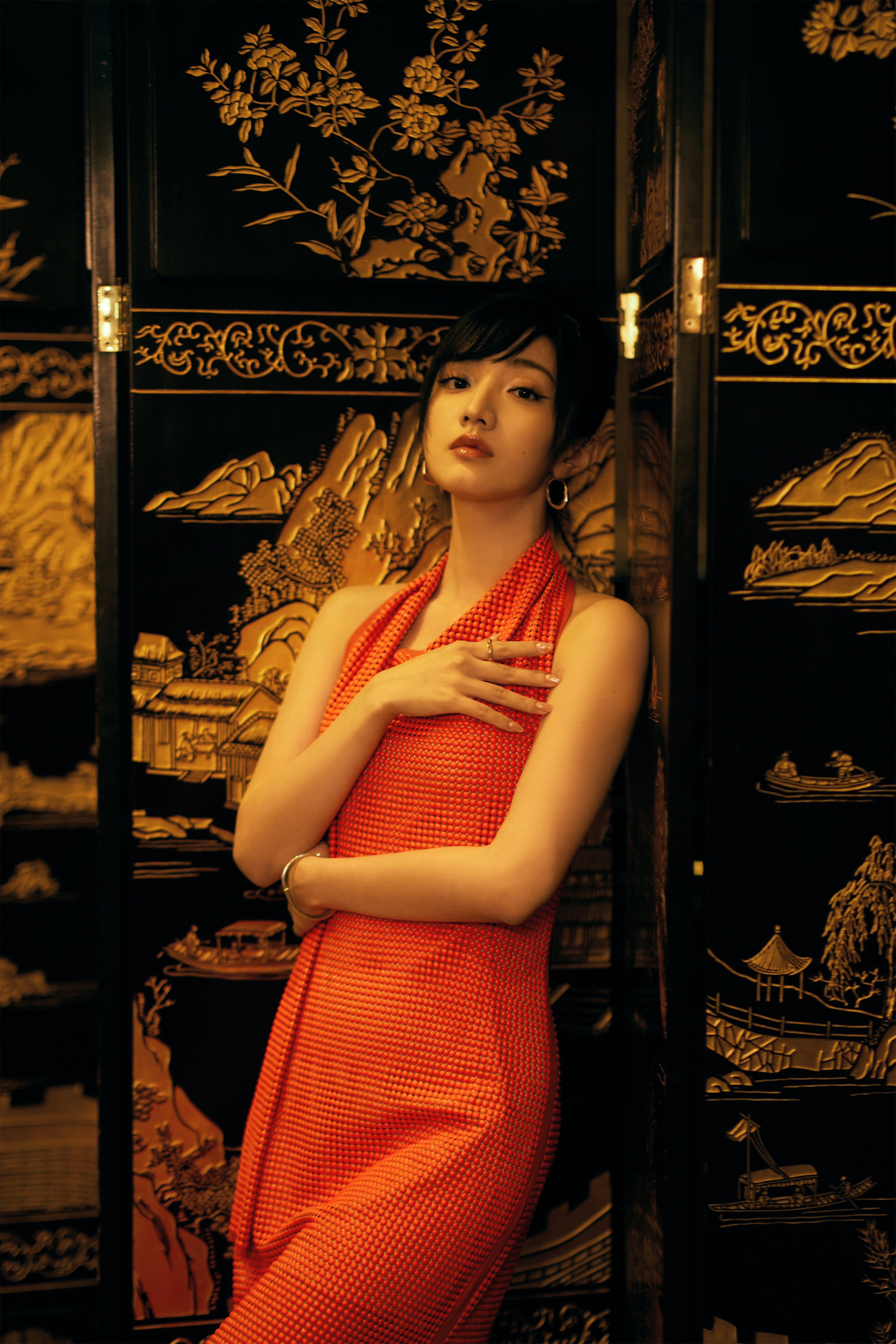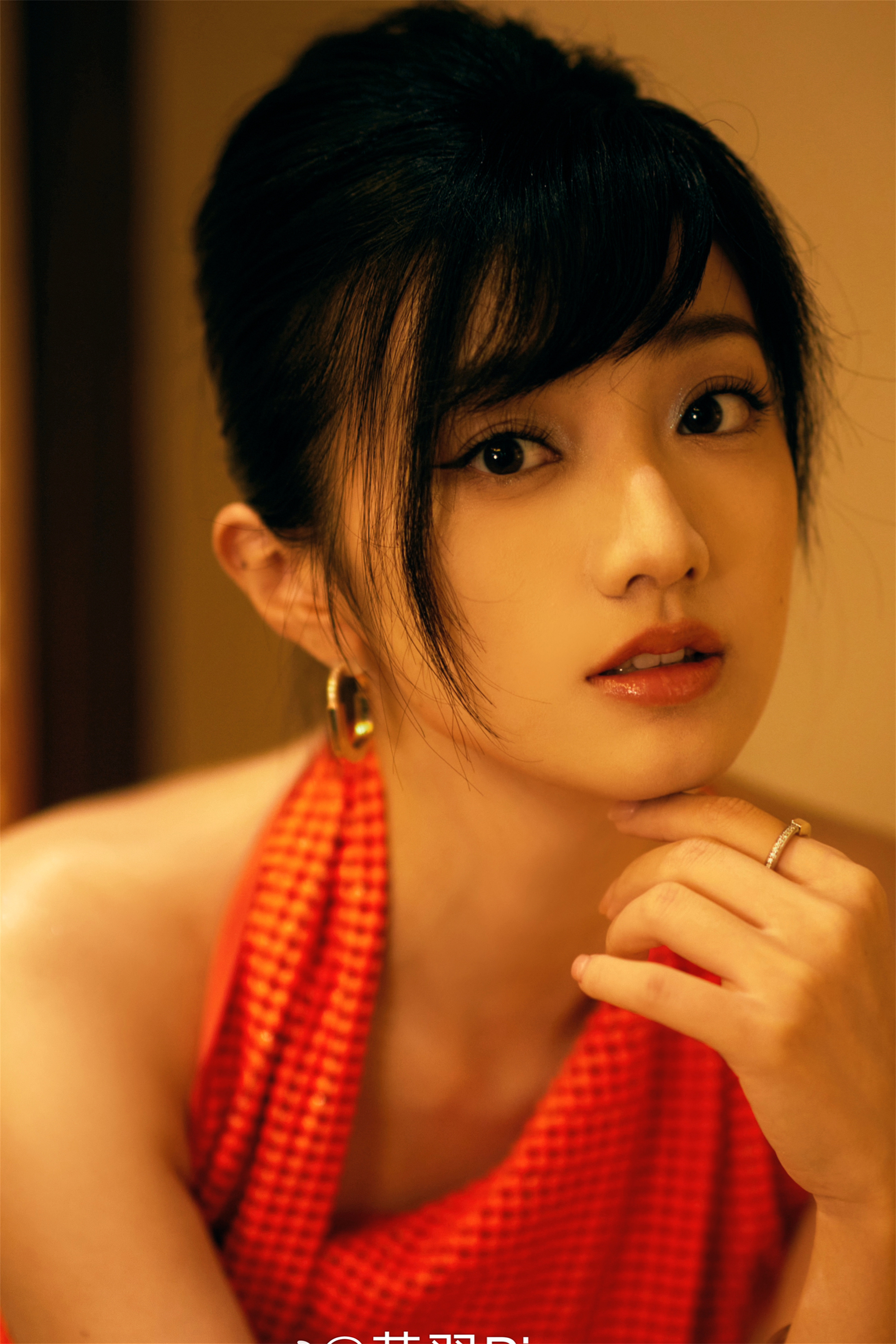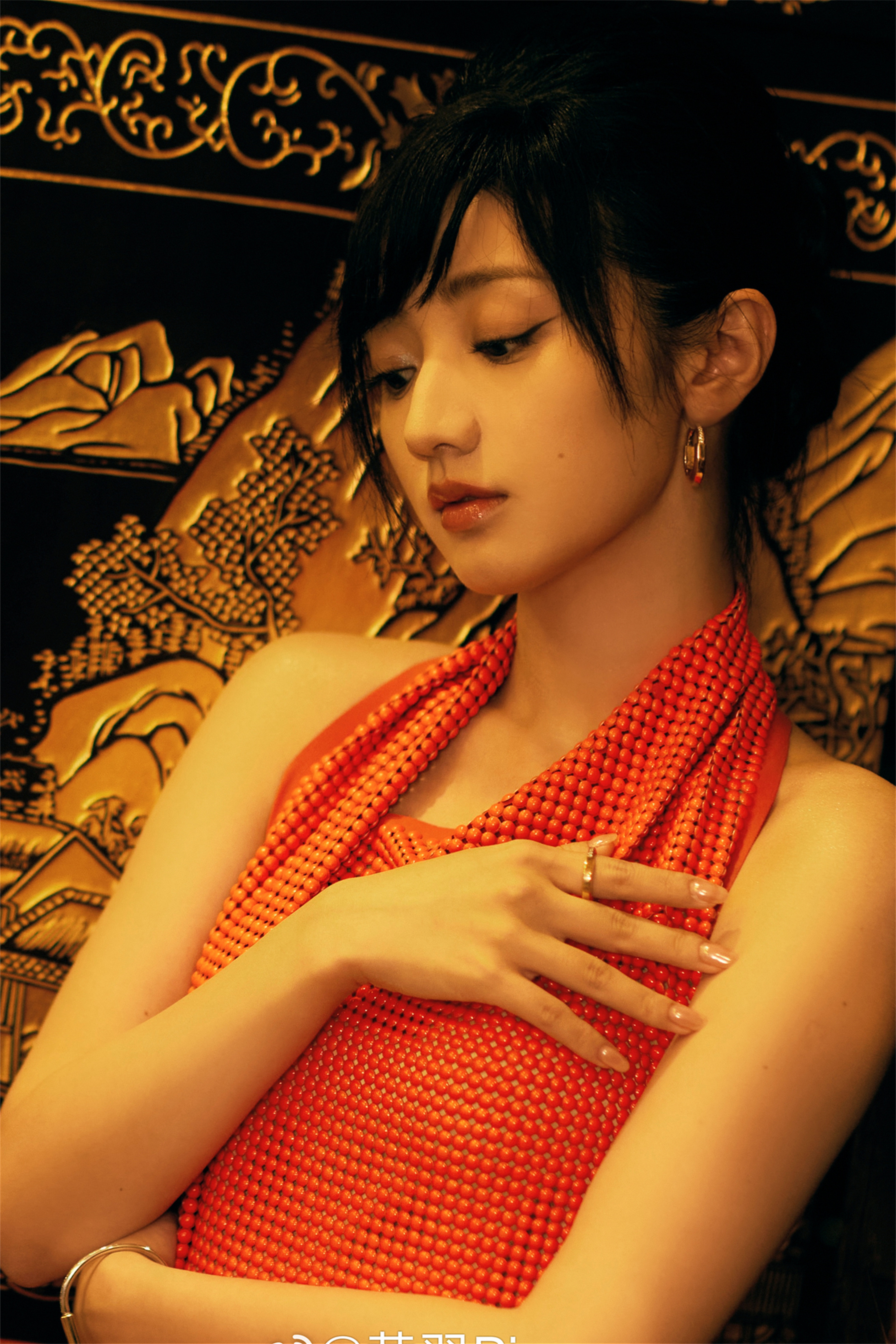 黄羿,一袭章丹色挂脖礼裙,灵动且优雅
