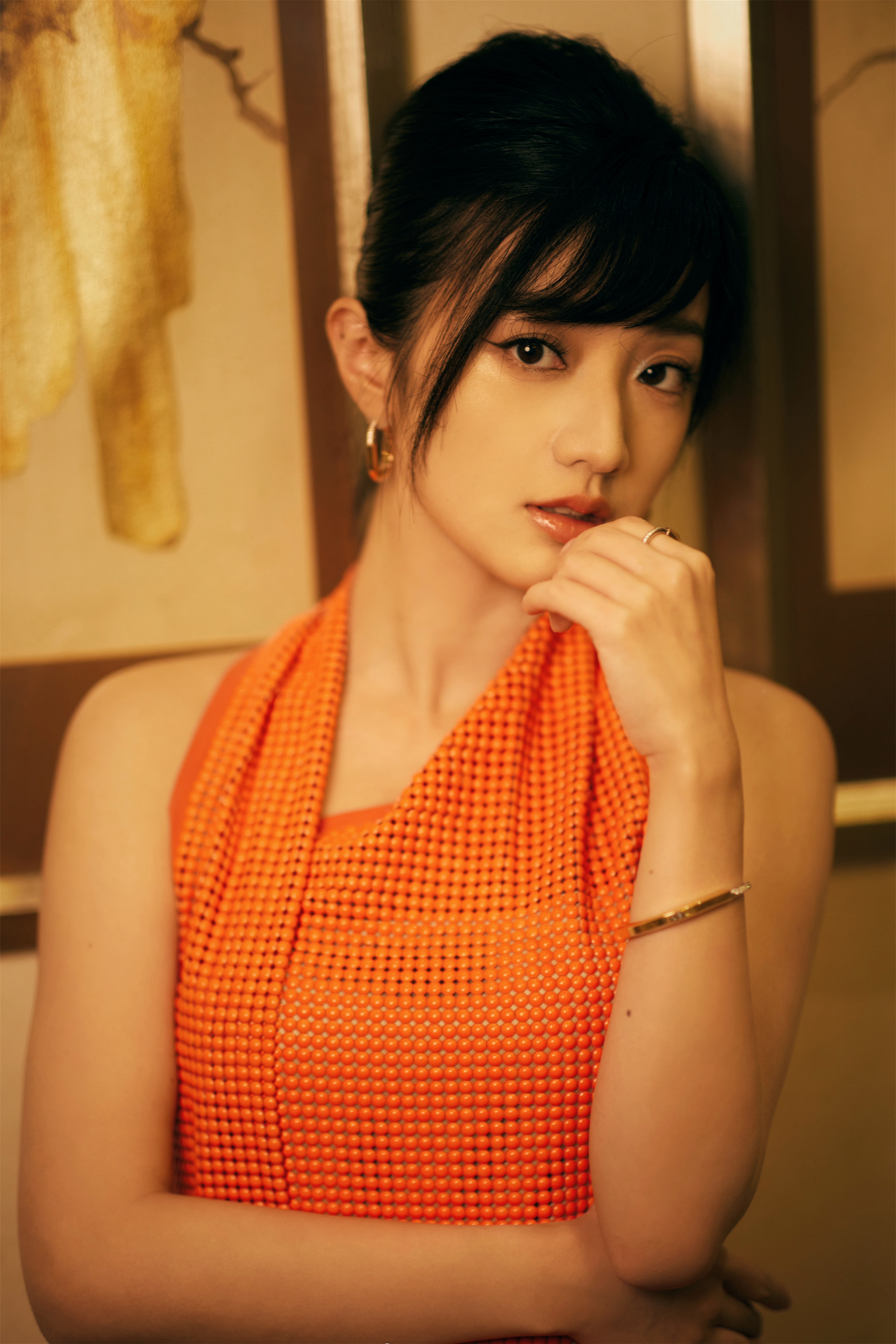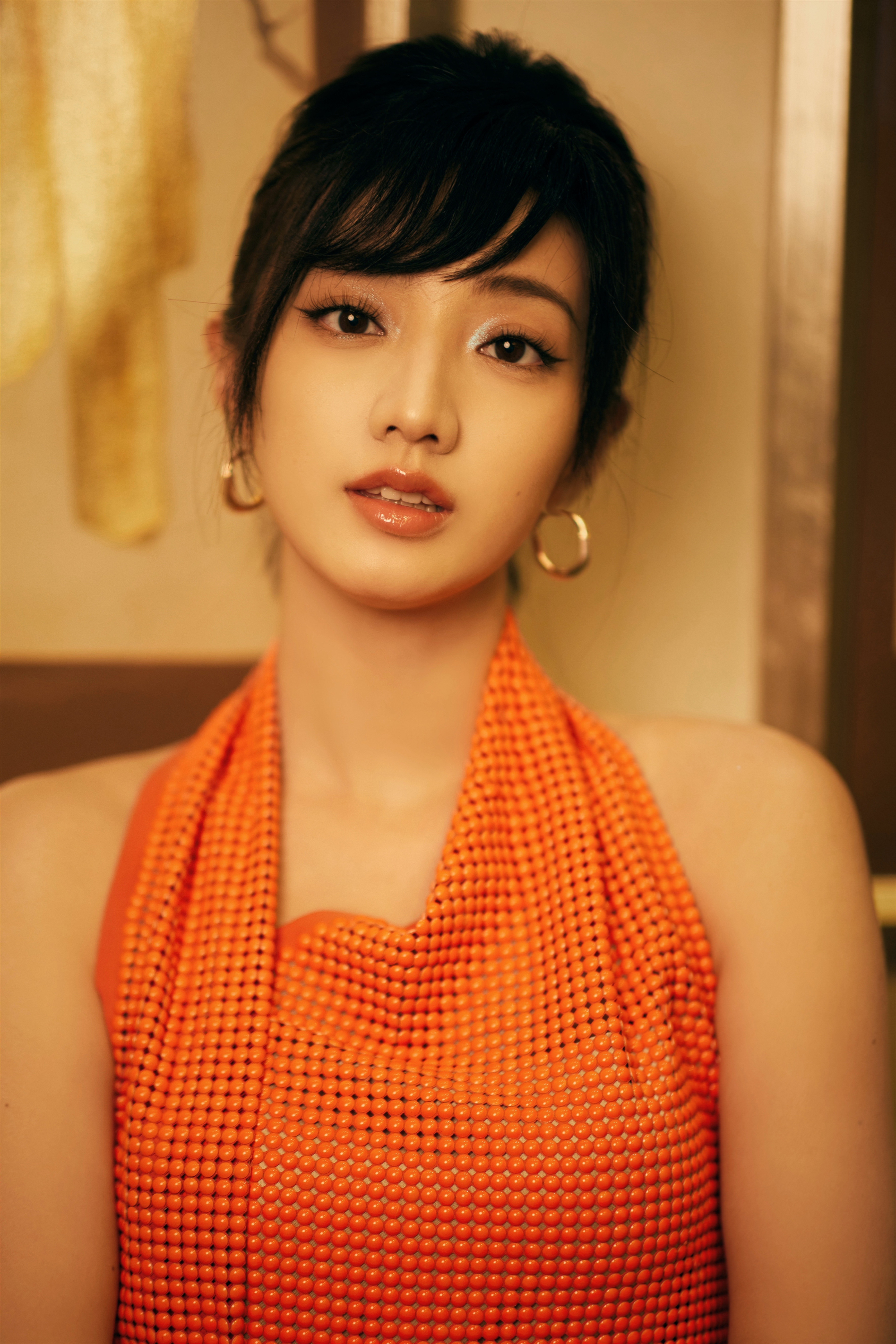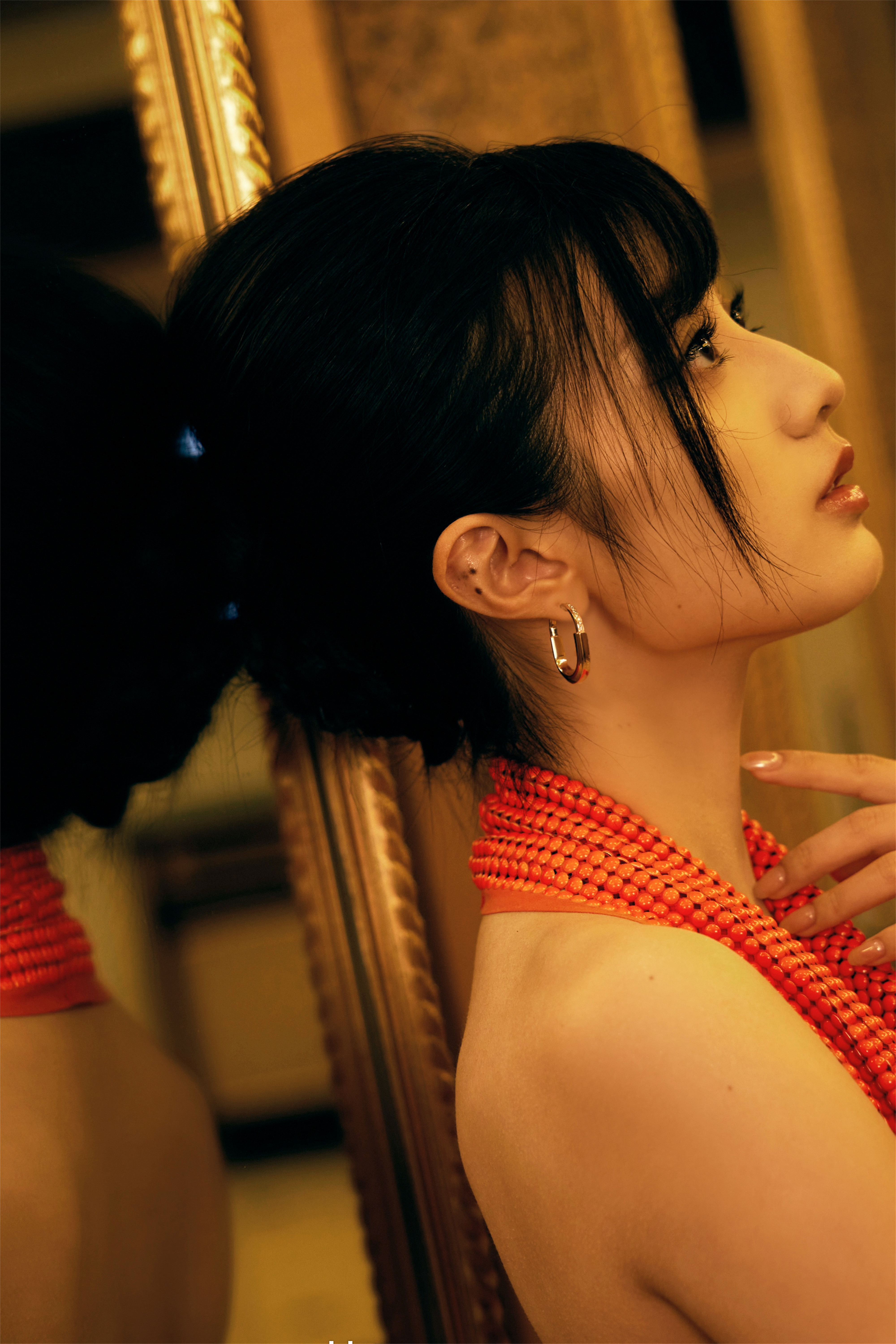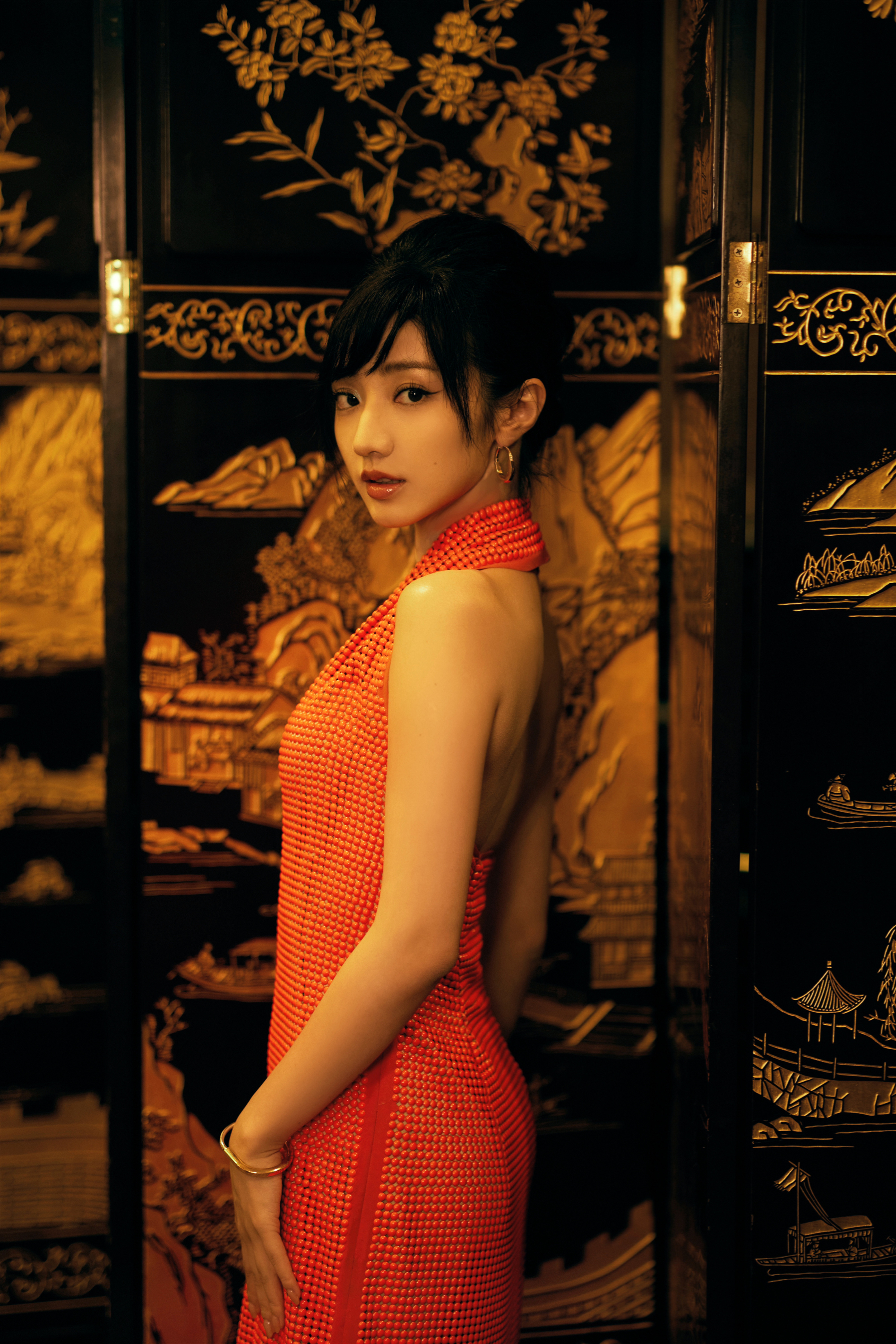 黄羿,一袭章丹色挂脖礼裙,灵动且优雅