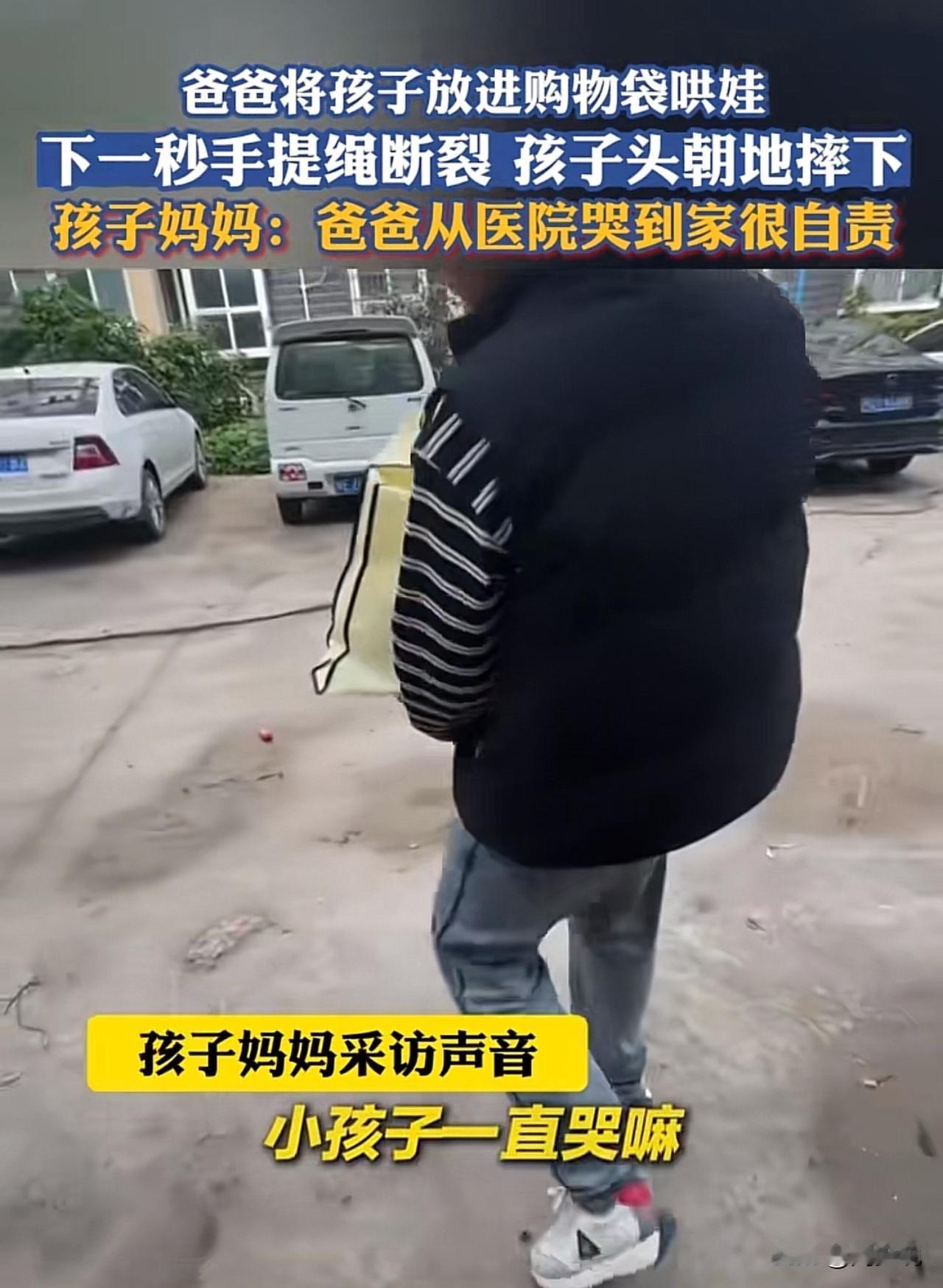 爸爸把孩子放到购物袋里哄孩子,没想到购物袋的手提绳突然断裂,孩子直接头朝下摔在地