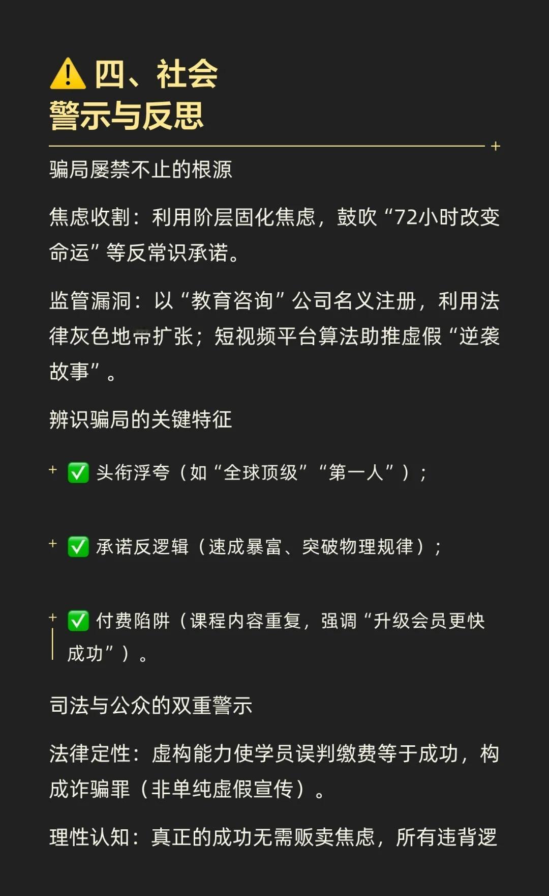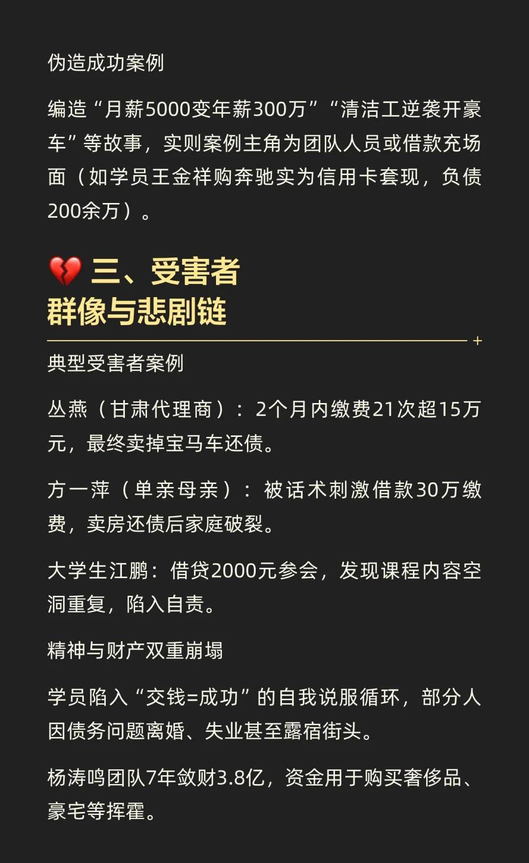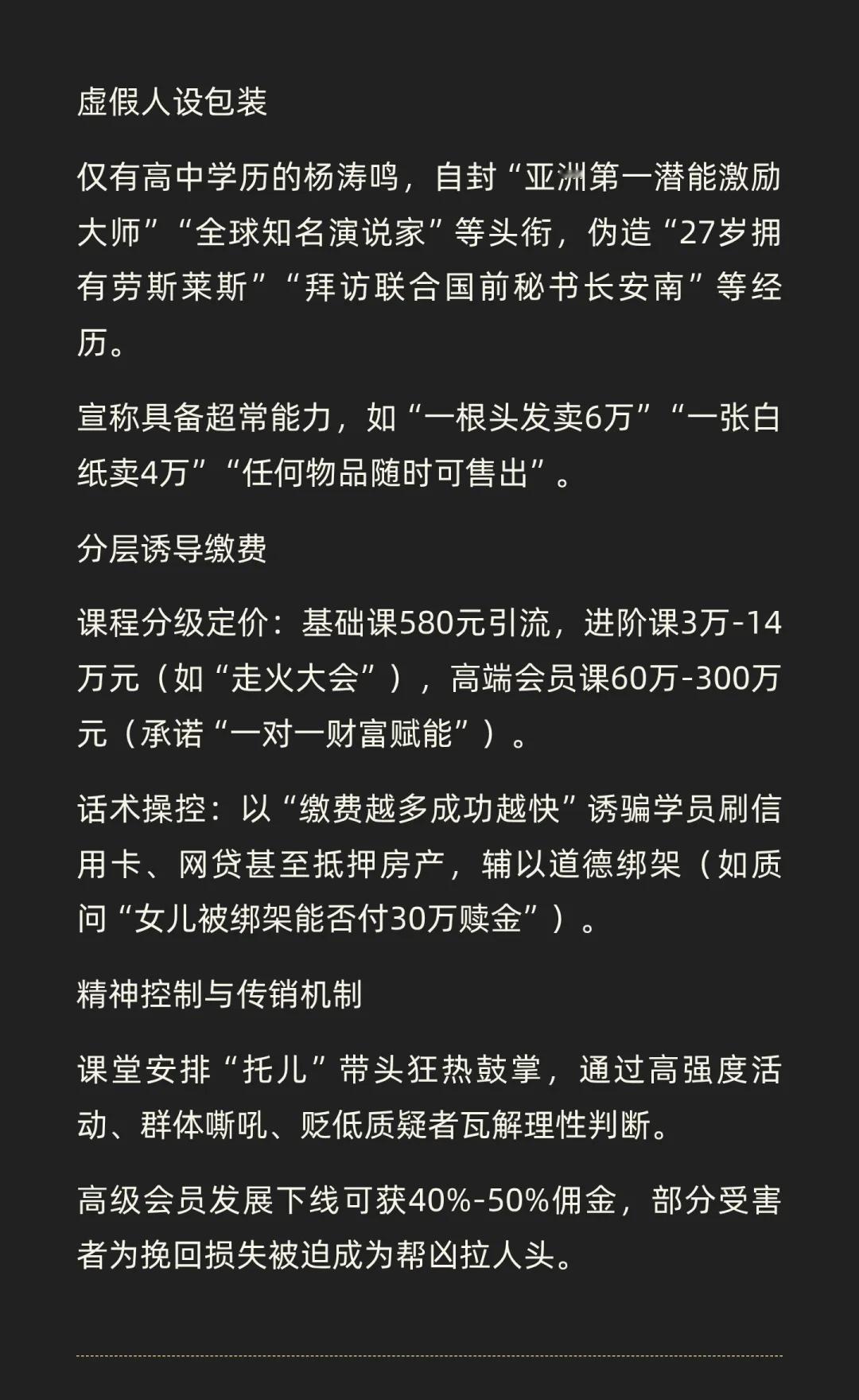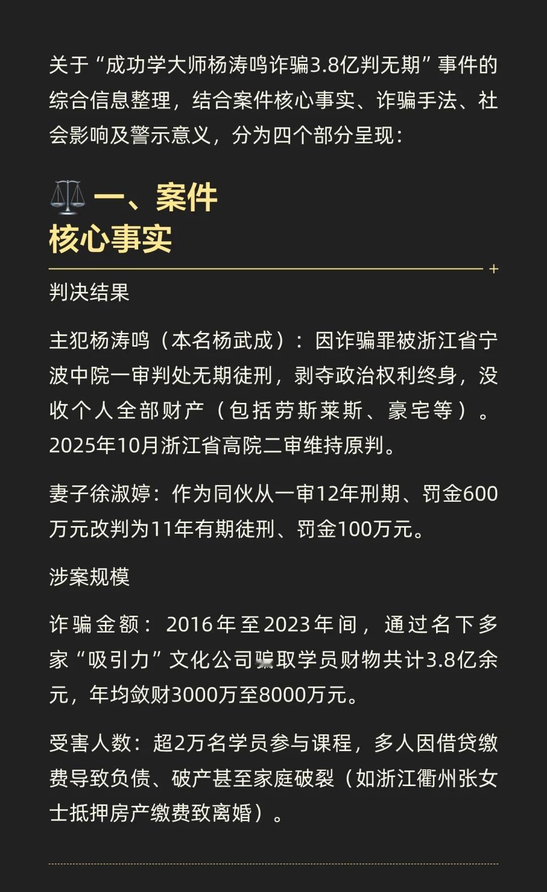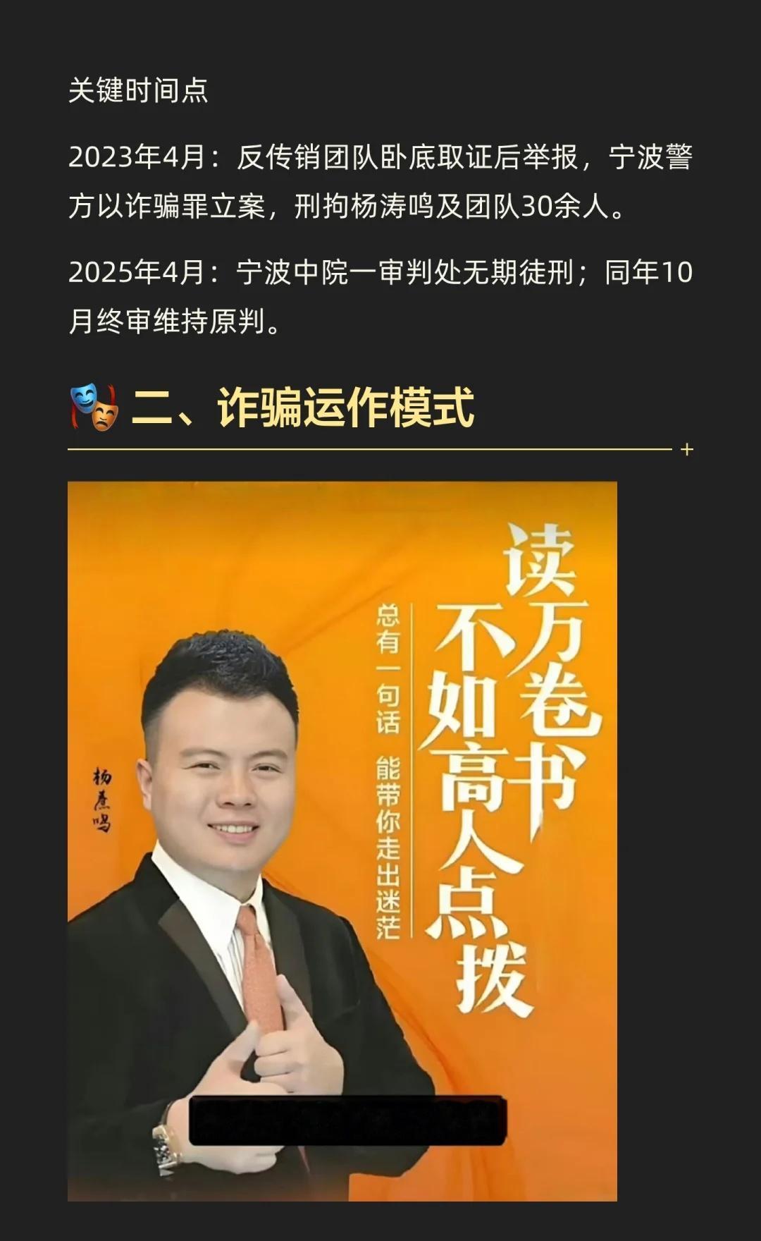 杨涛鸣诈骗案中,他通过虚假包装和分层诱导,骗取学员3.8亿,涉及2万名受害者。法院判处其无期徒刑,妻子获刑11年。此案揭示了“成功学”骗局的本质,提醒公众警惕虚假承诺,追求真正的成功。