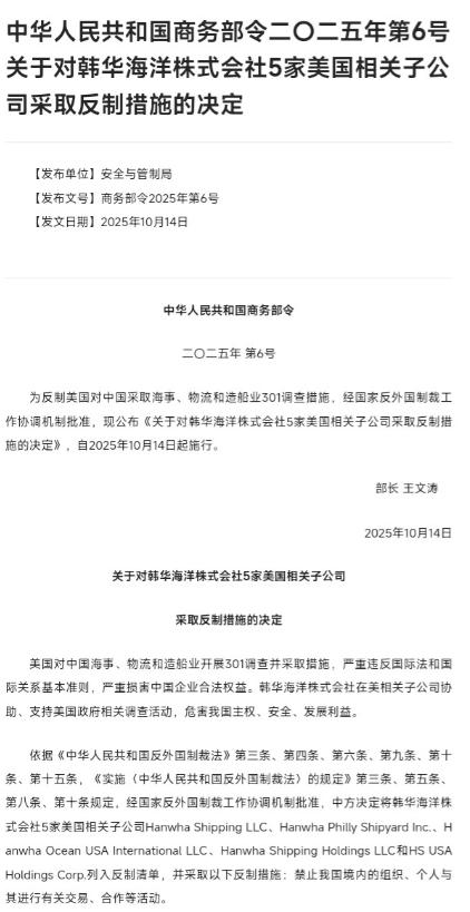 中美贸易战,韩企掏出215万亿“援美”,被中国商务部直接拉黑 14日,中国商务部发布公告,对韩华海洋株式会社的5家美国子公司发起反制,措施只有一条:禁止中国的公司和个人,与这些公司展开交易和合作。一言以蔽之,这些公司被中方彻底“拉黑”。 这事不是突然爆发的,韩华海洋那几家美国子公司被中方拉黑,纯粹是自己往枪口上撞,中美贸易战早从科技领域烧到了传统制造业,造船业就是最新的战场,而这家韩国巨头偏偏选了站在美国那边当帮手。 这些年,咱们的造船业早不是当年只能造小渔船的水平了,硬生生从追赶到变成了全球领跑,不管是运集装箱的货轮、装液化天然气的特种船,还是海上风电的工程船,中国船厂都能造,现在全球范围内,每十艘大型船舶里差不多就有四艘带着“中国造”的标签,市场份额快摸到40%的门槛了。 更关键的是,咱们的船不光质量过硬,交付速度还快,性价比更是甩其他国家一大截,自然成了国际市场的香饽饽。 美国那边早就坐不住了,他们本土的造船业这些年越来越不景气,船厂数量少不说,造一艘船的成本比中国高得多,在国际上根本没竞争力。 眼看中国企业抢了不少生意,特朗普政府就想出了阴招。一方面给中国船舶加征额外的港口费,让中国船进美国港口得多掏钱,变相抬高运营成本。另一方面直接搬出了“301调查”这个老工具,对着中国海事、物流、造船全产业链下手,想找借口加关税、搞限制,把中国企业挤出美国市场。 说白了,这就是典型的自己不行就打压别人。 就在美方这套组合拳打出来的时候,韩华海洋的美国子公司凑了上来,这家公司前身是韩国大宇造船海洋,本身就跟美国关系密切,在美国有造船厂还接了军用舰艇的项目。 这次为了讨好美国,几家子公司直接帮着美方搞调查,不仅提供了中国造船业的行业数据,还泄露了供应链信息,等于给美国递了把捅向中国企业的刀子。 商务部的公告里说得明明白白,这些行为已经危害到了我国的发展利益,触碰到了红线。 中方的回应来得又快又狠,10月14日那天,商务部直接发布了2025年第6号命令,把韩华海洋的五家美国子公司全列进了反制清单,这五家公司分别是HanwhaShippingLLC、HanwhaPhillyShipyardInc.这些,现在中国境内的任何企业和个人都不能跟它们做交易、搞合作。 这可不是象征性的警告,而是实打实的“拉黑”,依据的是《中华人民共和国反外国制裁法》,法理上站得稳稳的。 消息一出来,韩国市场立马有了反应,韩华海洋的股价当天就跌了超过5%,韩元兑美元汇率也冲破了1430,创下五个半月来的新高。 这还只是表面损失,真正要命的是失去中国市场,中国造船业每年的产值超过5000亿元,上下游带动几十万人就业,对配套设备、物流服务的需求大得惊人,这几家子公司以前靠着和中国企业的合作赚了不少钱,现在合作通道被掐断,营收肯定要大幅下滑,甚至会拖累韩华海洋总部的整体业务。 之前他们还想跟中国企业合作开发海上风电项目,现在这事儿基本黄了,信任基础都没了。 其实中方这步棋也是敲山震虎,韩国夹在中美之间本来处境就微妙,中韩每年的贸易额差不多有3000亿美元,中国买韩国的芯片、汽车配件,韩国从中国进电子产品、农产品,产业链早就绑在一起了,个别企业为了讨好美国就损害中国利益,最后只会让整个中韩合作氛围受影响,两边企业都得吃亏。 就像韩国《朝鲜日报》说的,这次制裁表面针对韩企,实质是中美贸易博弈的延长线,更是给韩美造船合作的“MASGA”项目泼了冷水。 有人担心这会不会影响中国造船业的供应链,其实完全没必要,这些年咱们一直在推进供应链自主可控,以前依赖进口的船舶发动机、导航系统、高端钢材,现在中国企业基本都能自己造了,质量还不比进口的差,就算少了韩华这几家供应商,中国船厂很快就能找到替代方案,根本不会被卡脖子。 反而这事儿会倒逼行业更注重自主创新,把主动权攥在自己手里,以后再面对外部打压腰杆更硬。 商务部新闻发言人答记者问的时候也说得很清楚,中方不是故意针对韩国,而是对事不对人,不管是哪国企业,只要敢帮着美国损害中国核心利益,就得承担后果。现在庆州亚太经合组织领导人会议快开了,中方选在这时候出手,政治信号很明确:想在中美之间玩投机取巧的把戏,没门。 说到底,韩华海洋这几家子公司就是当了出头鸟,跟着美国打压竞争对手,短期可能能拿到点好处,但长期来看,失去中国这个全球最大的市场,绝对是得不偿失。 这事儿也给所有跨国企业提了个醒,在中美博弈的大背景下,选边站可以,但得想清楚后果,别最后赔了夫人又折兵,中方从来不会主动挑事,但别人都打到家门口了,也绝不会忍气吞声,该出手时就出手,这就是大国底气。