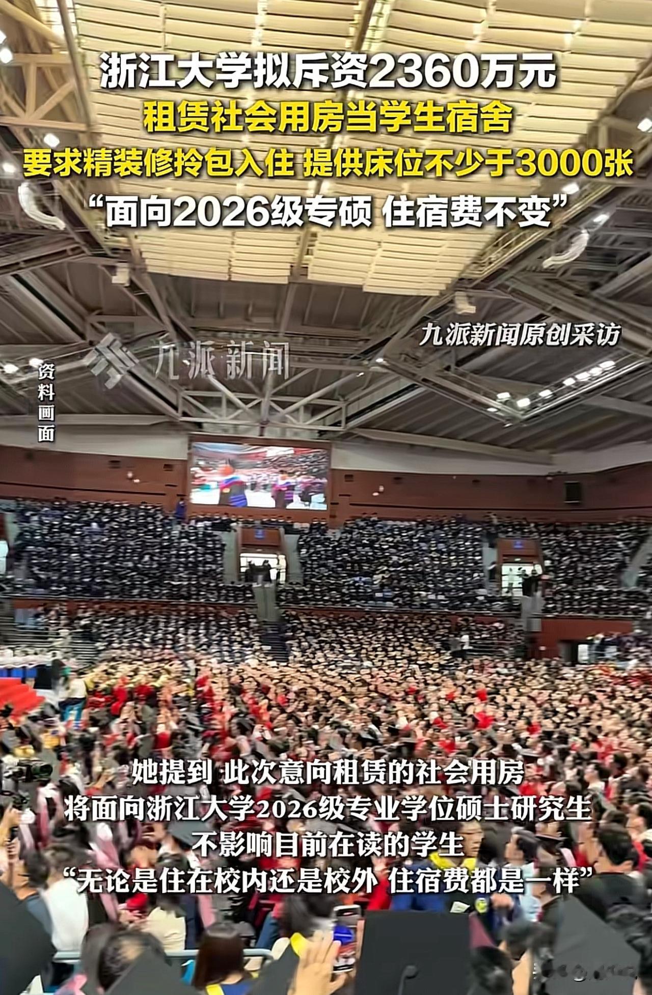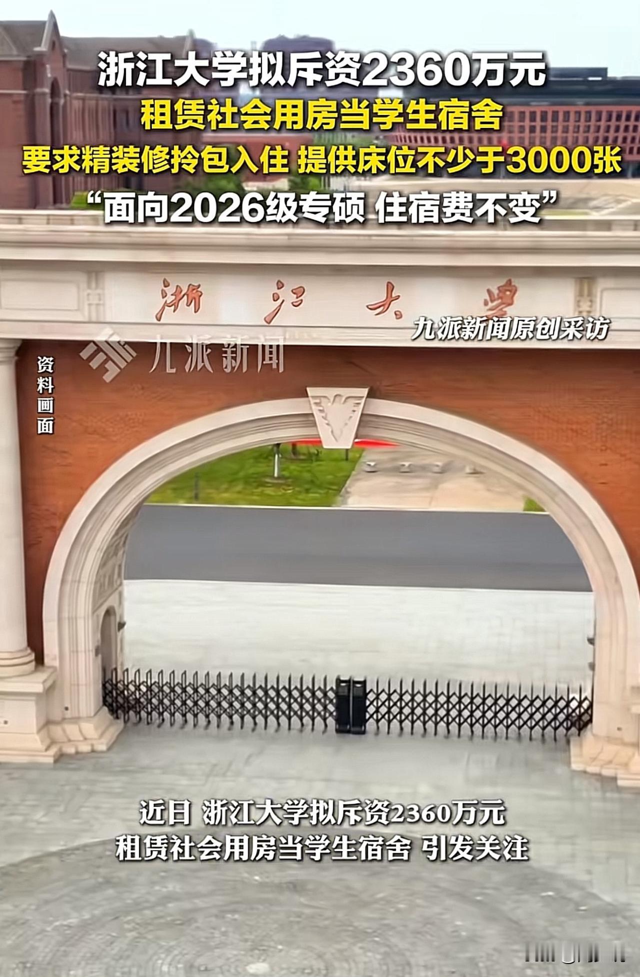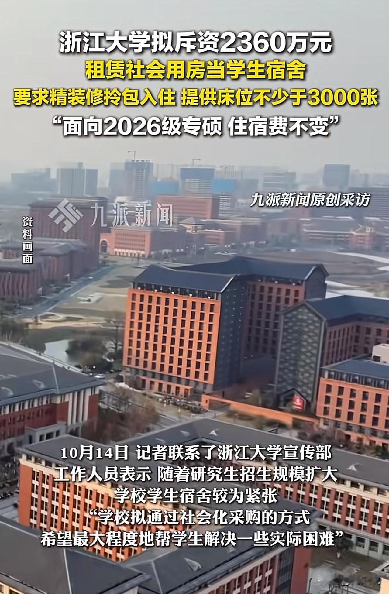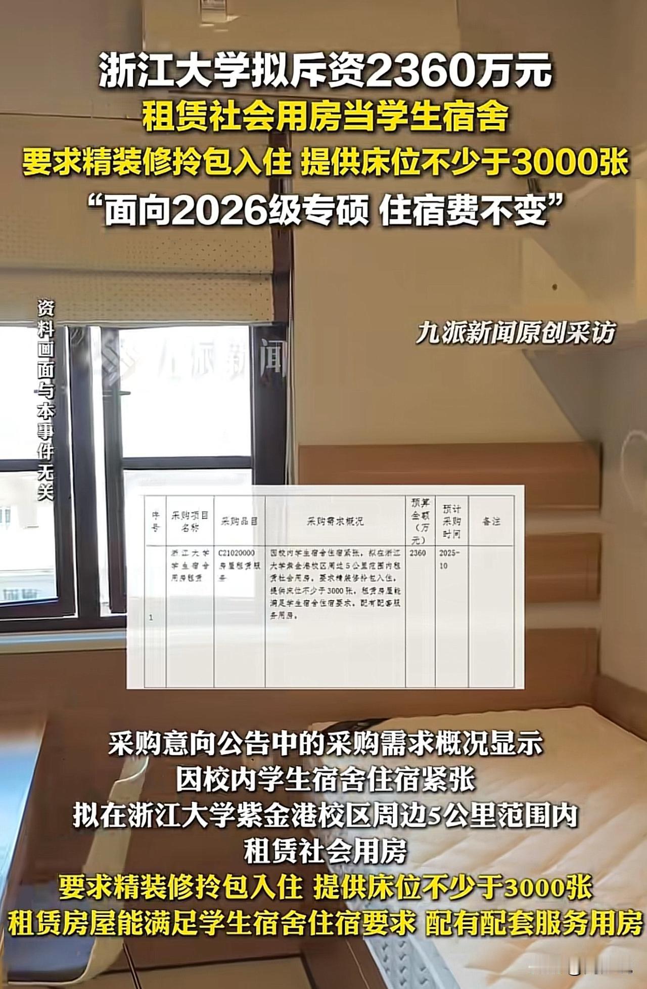 “这下血本了!”近日,浙江大学发布采购意向公告,计划在紫金港校区周边5公里内租赁精装修社会用房作为学生宿舍,提供不少于3000张床位。 原因是因研究生扩招,校内宿舍紧张,此举旨在解决专硕住宿问题。校方强调,住宿费与校内一致,不影响在读生,仅面向2026级专业学位硕士。 浙大租校外房给专硕,在周少看来,其实是扩招后住宿紧张的无奈之举。学校能保证住宿费不变,说明在尽力减轻学生负担。 但从教育角度看,宿舍不仅是睡觉的地方,更是学习交流、形成归属感的重要场所。这也会引发新问题,通勤时间以及学生安全管理,这些都是不容忽视的问题。 你觉得浙大这种做法值得推广吗?或者你有什么更好的建议来解决高校住宿紧张问题?#寻美三湘# #长沙新朋友#