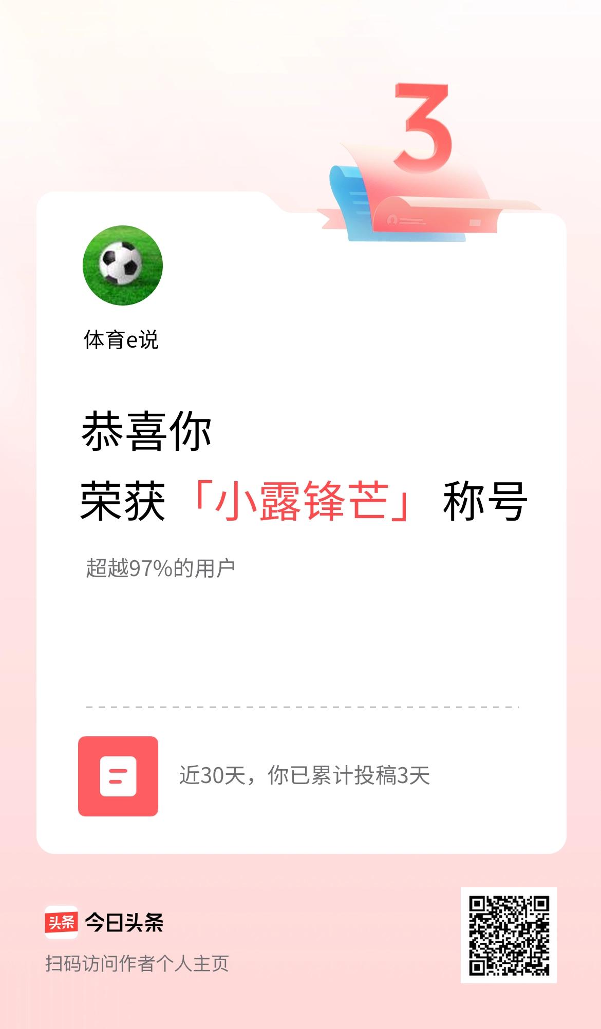 我在头条30天内投稿打卡3天,获得“小露锋芒”称号