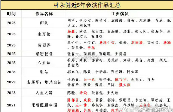 林永健近五年合作的艺人林永健近五年合作过的演员林永健近五年合作不断,《盛装》里有宋佳、袁咏仪,《平凡英雄》与李冰冰、冯绍峰搭档。