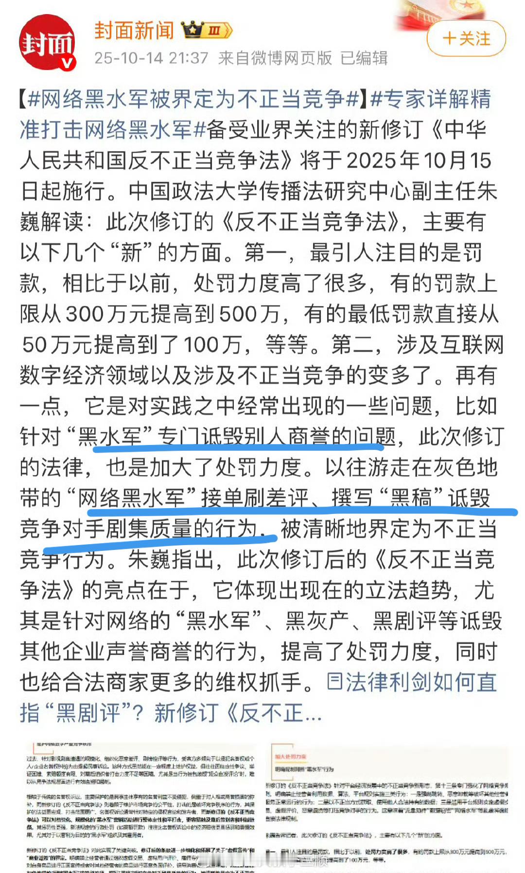 新修订的《反不正当竞争法》点名网络黑水军操作下的影视行业不正当竞争行为,广电也在