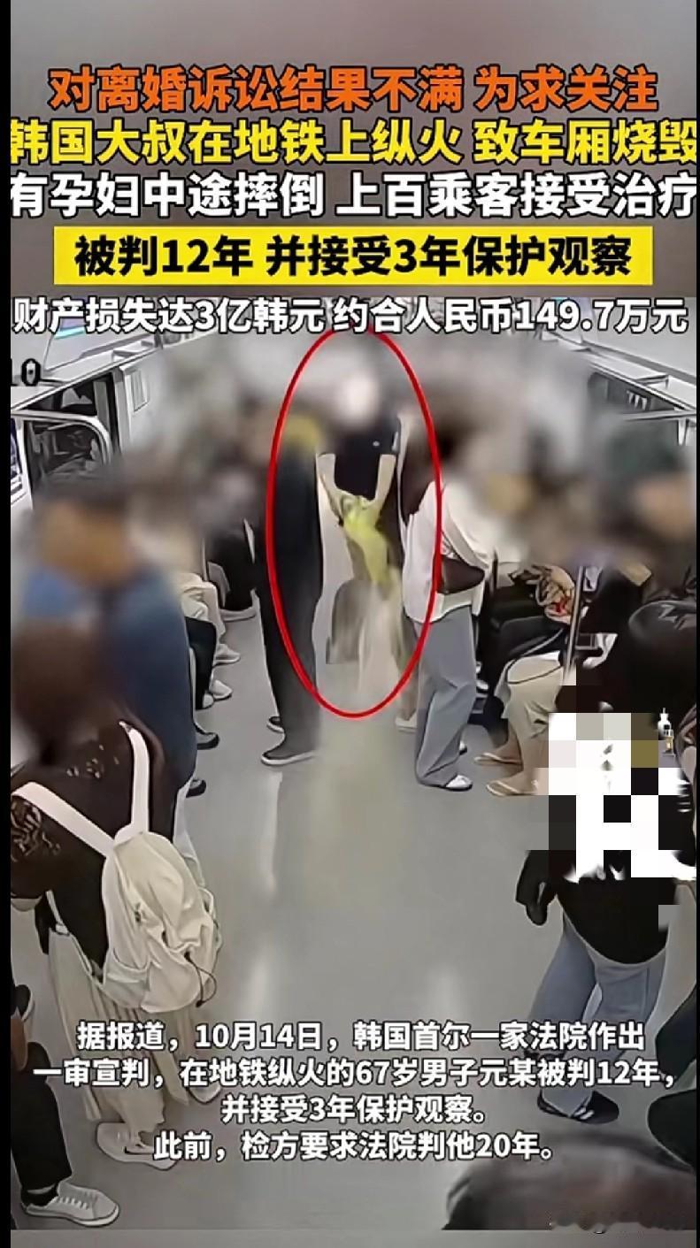 “我的天!韩国一67岁大叔因为对离婚诉讼结果不满,为了博关注居然在地铁上纵火!车厢被烧得稀烂,还有孕妇中途摔倒,上百个乘客都得去医院治疗,财产损失高达3亿韩元(差不多150万人民币)。今天首尔法院一审判他12年,还要接受3年保护观察,不过检方之前要求判20年呢。就为了自己那点破事,害了这么多人,这也太荒唐了!你们觉得这判决合理不?来唠唠~”