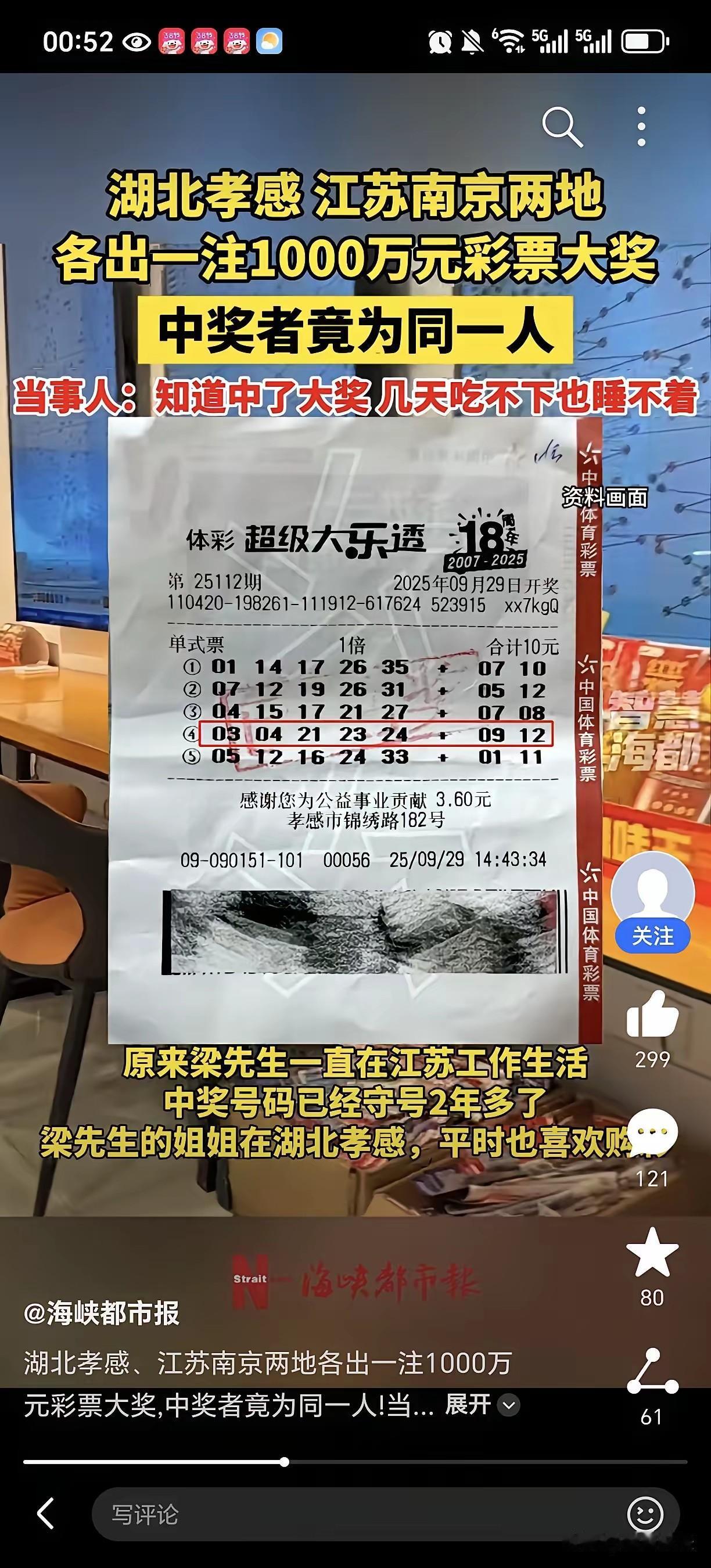 梁先生的运气堪称逆天!他是个“彩票迷”,购彩三四年,用“自选 + 机选”的方式守同一组号长达两年多。因工作繁忙,他让在湖北的姐姐每期帮忙购买这组号码。 9月29日超级大乐透开奖,全国仅有7个一等奖,他一人独中两个1000万,湖北孝感和江苏南京两地的大奖都被他收入囊中。得知中奖消息后,他兴奋得几天吃不下睡不着。10月9日,他先前往南京领奖,次日飞往湖北与姐姐一同领奖,这让工作人员和记者都大为震惊。 不过,彩票中奖全凭运气,大家还是要理性投注,切勿上头,不然只能眼巴巴看着梁先生的“传奇”经历啦!