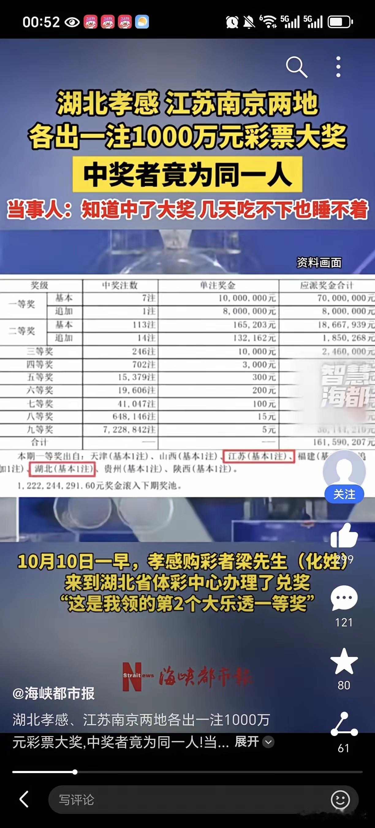 彩票界再爆大新闻!湖北孝感与江苏南京两地开出的1000万大奖,得主竟是同一人——