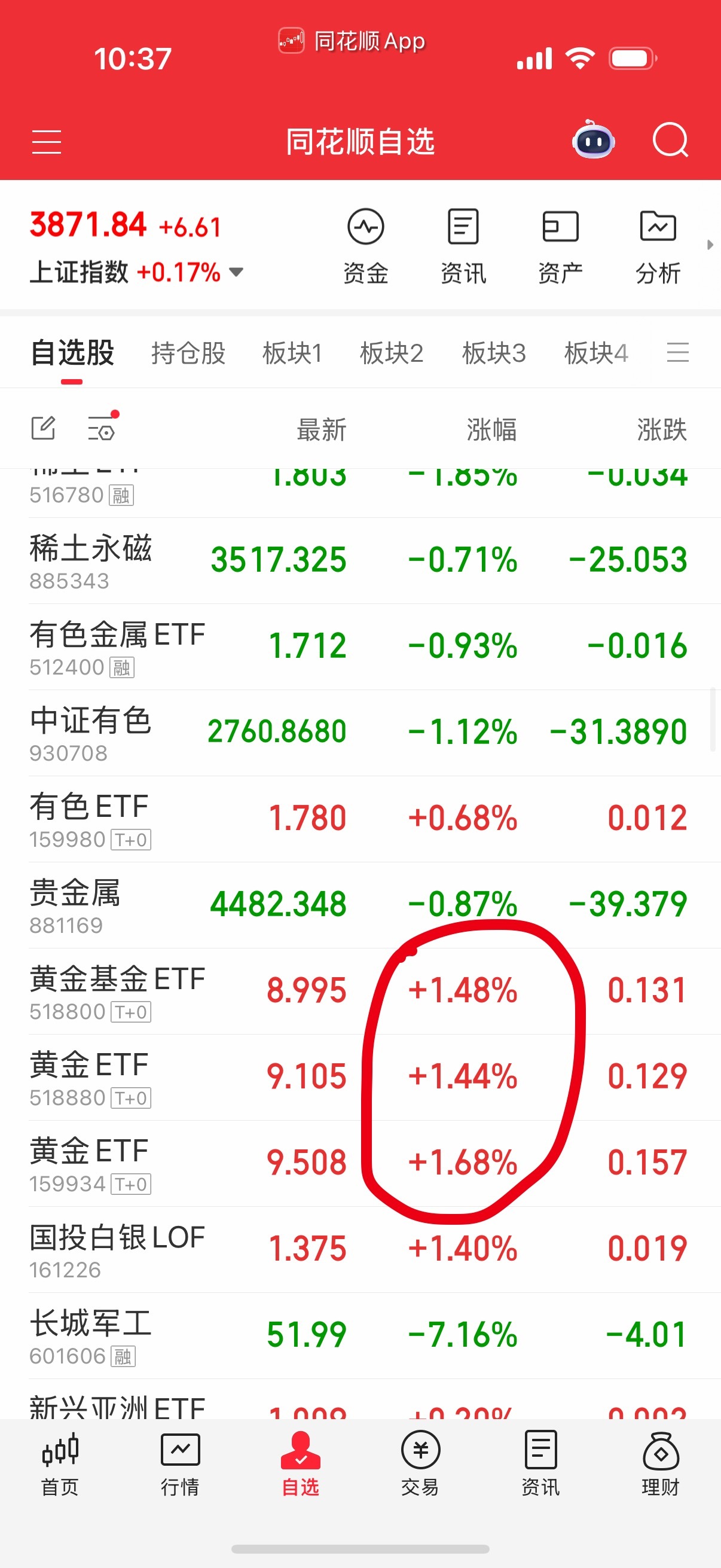 有色稀土跳水,把黄金带下去了。有兴趣去买点黄金看看有没有差价,国际黄金期货没有问