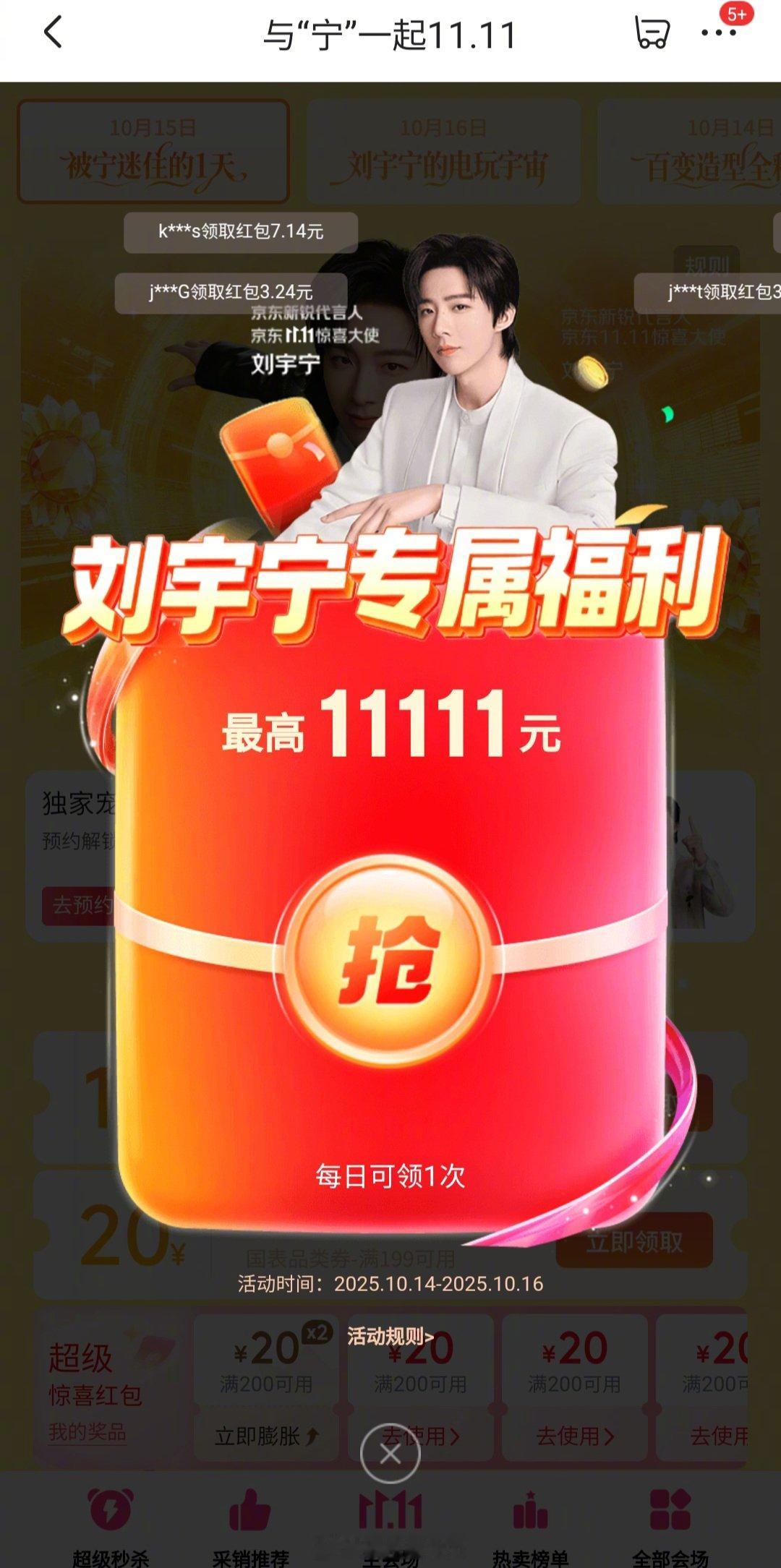 双十一福利播报!刘宇宁专属活动上线,搜索关键词即可领取红包,还有秒杀活动等你参与,错过真的拍大腿!刘宇宁京东红包