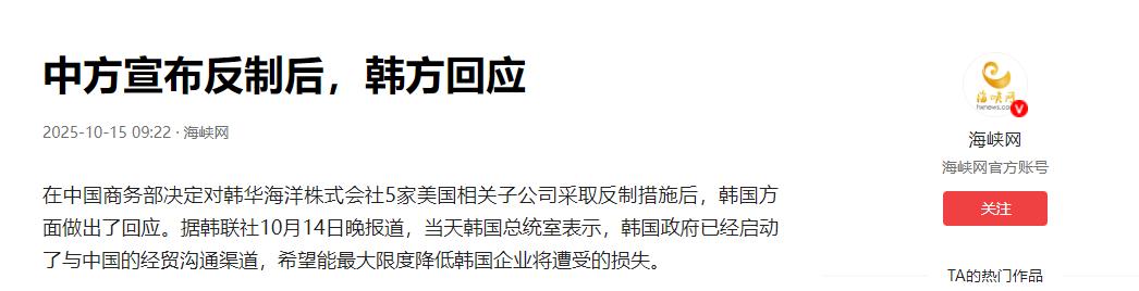 韩国外交部14日宣称,将与中国进行沟通,以降低中国针对造船商韩华海洋旗下美国相关子公司的反制措施所带来的影响。 韩国外交部赶着找上门沟通,根本不是怕中国给脸色,而是韩华海洋这颗 “棋子” 快被反制措施捏得喘不过气了,背后连着的更是韩国造船业的半条命。 这事得从美国那波操作说起,美东时间 10 月 14 日刚对中国海事、造船业搞起 301 调查的限制措施,中国这边当天就甩出反制清单,精准点了韩华海洋 5 家美国子公司的名,Hanwha Philly Shipyard 这些核心企业全在里面,直接禁止国内任何组织和个人跟它们做生意,这 “一分钟回击” 的速度简直不给缓冲时间。 谁让韩华海洋自己往枪口上撞呢,这家前身为大宇造船的巨头,跟现代重工、三星重工并称韩国造船 “三巨头”,全球市场份额常年占着 5%-8%,本该安安分分做买卖,却非要当美国 “让美国造船业再次伟大” 计划的马前卒。 斥资 1 亿美元收购费城船厂不说,还承接美国海军补给舰维修业务,计划追加 50 亿美元投资,连韩国总统都亲自去费城船厂给新船站台,架势摆得比谁都足。 更要命的是,它在 301 调查听证会上不光公开支持对华制裁,还给美方递了 “最大化打击中国航运” 的建议方案,这波 “递刀” 操作相当于把自己绑在了美国战车上,中国按《反外国制裁法》出手,完全是按规矩办事。 可韩华海洋压根没算明白,自己的命门早就攥在中国手里了。它造船上用的钢材 70% 得从中国进口,稀土永磁电机的原料超七成依赖中国供应,现在反制措施一落地,供应链直接被卡断。 要知道它手里握着不少高价订单,光是给美国造的 5 艘国家安全多任务船,每艘造价就高达 3 亿美元,这些项目缺了中国的原材料,要么停工待料,要么就得找替代供应商,可一时半会哪有那么容易? 市场早就给出反应了,反制消息一出,韩华海洋股价当天就跌了超 5%,韩元兑美元汇率直接跌破 1430 关口,首尔金融市场都跟着抖了三抖。 更糟的是,韩国造船业早就不是当年的光景了,现在正被人力短缺的问题熬得头疼。巅峰时期 2014 年还有 20.3 万人吃造船这碗饭,到现在只剩 9.3 万人,少了一半还多,光是技能工人缺口就有 2 万到 3 万人,现代重工造船部门近三个季度开工率都不足 64%。 为了招人,韩国政府都放宽了外籍劳工限制,把引进比率从 20% 提到 30%,签证审批时间从 4 个月砍到 1 个月,可就算这样还是补不上窟窿。 本来订单好不容易回暖,2025 年一季度拿了 136 亿美元新单,同比涨了 41%,结果碰上供应链断供,在建项目延期风险陡增,延期交付可是要赔巨额罚款的,这对刚有点起色的韩国造船业来说,简直是屋漏偏逢连夜雨。 韩国心里比谁都清楚,中国在造船业的分量根本绕不开。2025 年 4 月中国新船订单量又重回全球第一,562 万载重吨的订单占了全球 57.8% 的份额,韩国才 38%,手持订单更是没法比,中国 3095 万载重吨,韩国只有 672 万载重吨。 虽然韩国在 LNG 船领域还占着点优势,手持订单 242 艘是中国的两倍,但造这些高附加值船舶同样离不开中国的原材料和配套供应。 之前 2023 年韩国求中国暂缓锂电池强制认证,结果没成,这次韩华海洋的事更严重,要是反制范围扩大到现代重工、三星重工这些也跟美国合作的企业,韩国造船业就得彻底慌神。 说到底,韩国就是被自己的 “两头押注” 坑了。一边想抱美国大腿赚军工订单,一边又舍不得中国市场和供应链的便利,以为能靠着中美博弈捞点红利,比如之前美国打压中国船企时,韩国趁机抢了 3 月的订单冠军,LNG 船单船造价从 1.63 亿美元涨到 2.51 亿美元。 可这红利根本不长久,中国一出手精准打击美国的关键合作伙伴,就把韩国架在了火上。现在对华出口已经连续 11 个月下滑,4 月同比降了 26.5%,要是造船业再受重创,韩国经济更扛不住。 所以韩国外交部急着沟通一点不奇怪,这根本不是什么外交斡旋,说白了就是求中国 “网开一面”,别把韩华海洋往死里逼。 可中国的反制措施是按法律来的,既有《反外国制裁法》当依据,交通运输部还启动了供应链安全调查,留着后手呢。 韩国要是真想去沟通,得先想明白怎么平衡跟中美两边的关系,总不能既帮着美国打压中国,又指望中国给它留着便利,天下哪有这么好的事?要是还拎不清,下次可能就不是沟通这么简单了。