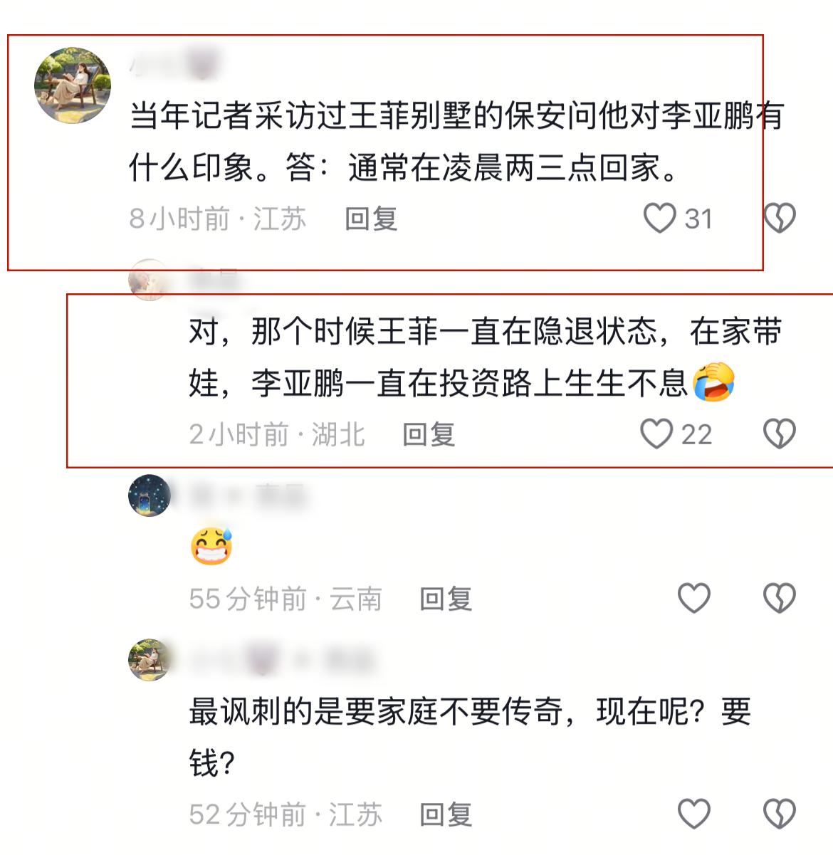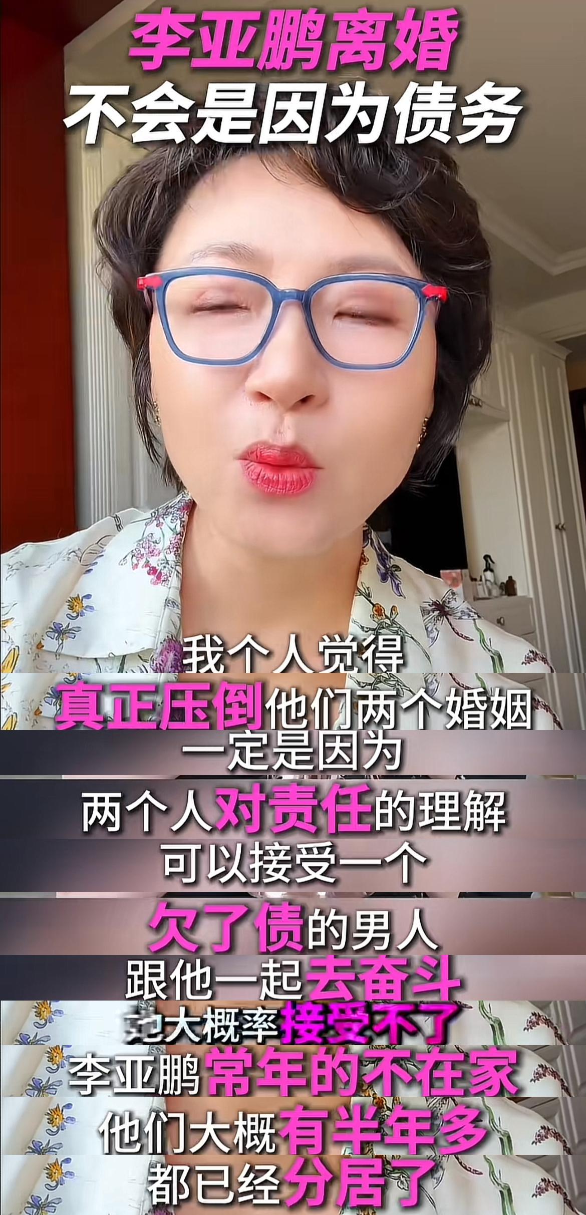 原来王菲别墅的保安早就说出了真相。 昨天(10月14号),李亚鹏与海哈金喜官宣离婚,并透露孩子跟随母亲生活,未来共同抚养孩子。虽然惋惜,但很多人对两人离婚的原因感到非常疑惑?到底是什么导致了婚姻的失败呢? 由于李亚鹏在这之前欠下了很多的债务,所以大部分网友认为离婚的原因无非就是债务,贫贱夫妻百事哀,事实真的如此呢? 从李亚鹏欠债的时间线来推断这一原因,得出的结论绝对不是。 如果是因为债务,海哈金喜不可能与其登记结婚,也不能举行婚礼,要知道李亚鹏早在18年左右就有很多的债务,而且在这期间,海哈金喜也跟着李亚鹏做直播还债,那么具体是什么呢? 一位名叫路彬彬的主持人表示,她与两人都认识,在她看来,离婚的原因是聚少离多,李亚鹏经常在外工作还债,缺乏了对海哈的陪伴,长此以往导致的结果必然是“离婚”,一个女性需要的不就是安全感吗?钱固然重要,但有能力,又岂会愁,所以根本的原因还是聚少离多,而离婚也应该是海哈提出来的。 有一位看过当年王菲与李亚鹏八卦的网友表示,当年有记者采访王菲别墅的保安,问他怎么看李亚鹏,他则表示,李亚鹏凌晨三点多才回来。 试想一下,这样的一个男性,即便她很有钱,你会愿意吗?