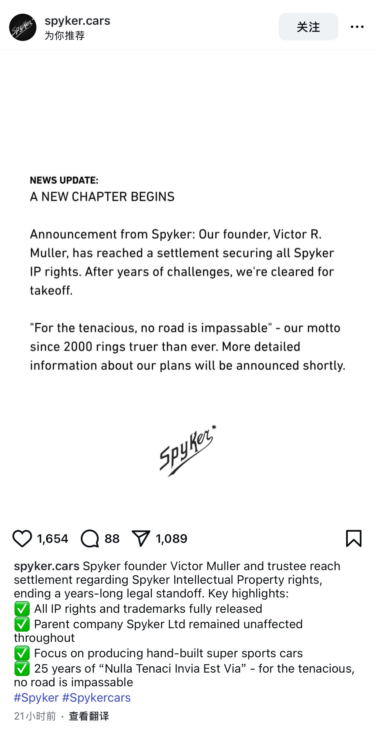 今天的新闻是,Muller刚刚宣布,他和进入破产程序的旧公司债权人达成了协议,重新拿回了所有的知识产权,他们将用新实体来运营造车业务,回归到手工打造超级跑车的核心业务。
