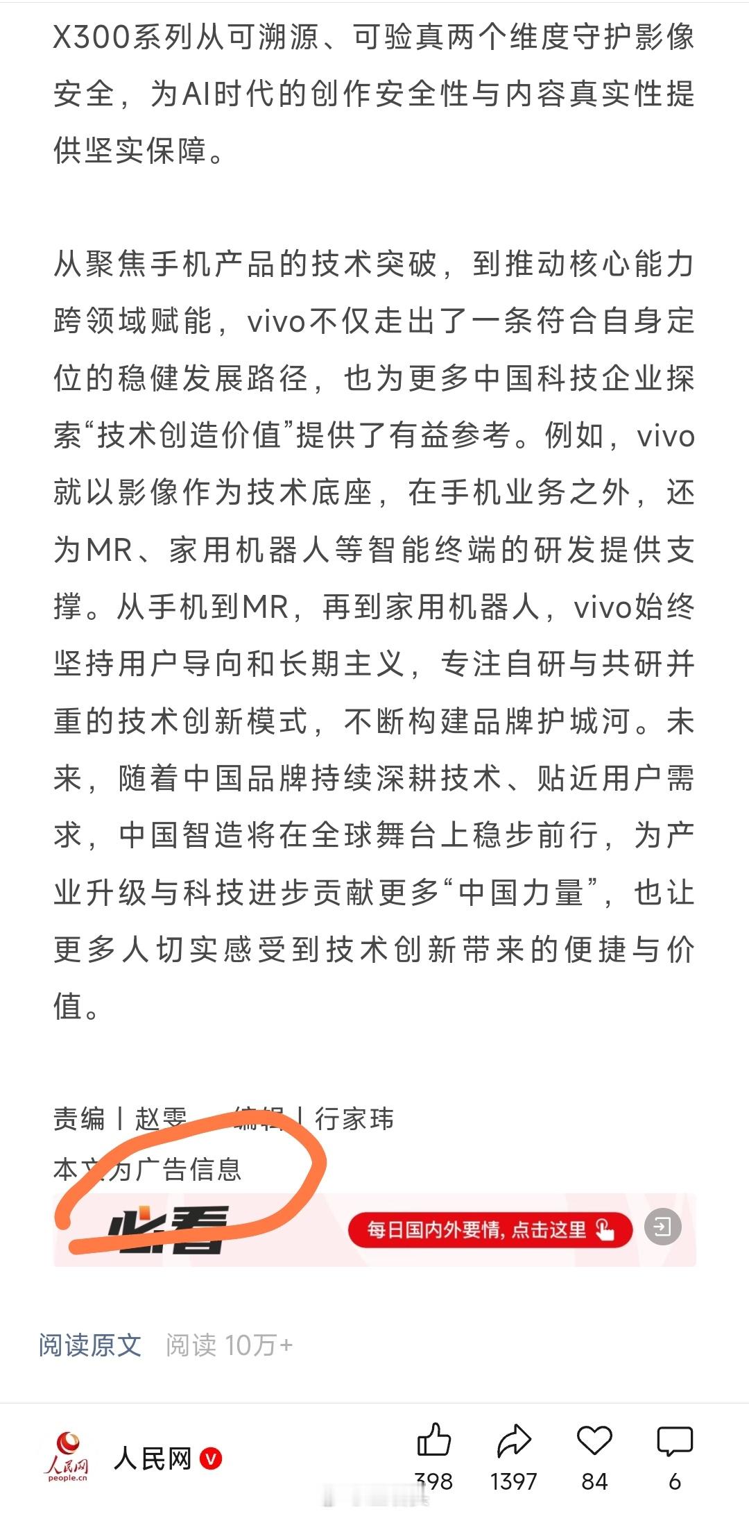 现在vivo也上人民网头条了,底下清清楚楚写着“广告”。