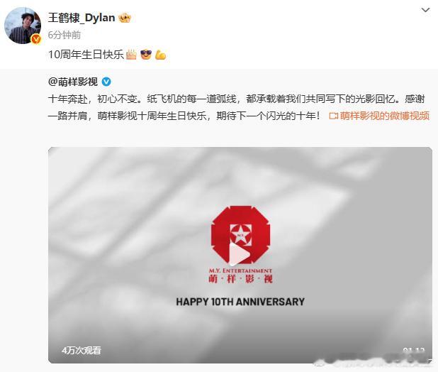 王鹤棣10周年生日快乐王鹤棣为萌样影视10周年庆生萌样影视十周年庆,王鹤棣发博