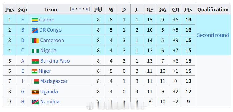 特别说明:由于E组的厄立特里亚退赛(所有比赛判负),对比成绩最好的小组第二时,对阵小组最后一名的主客场比赛,结果和分数不与计算,这也是尼日利亚力压布基纳法索进入附加赛的关键原因。