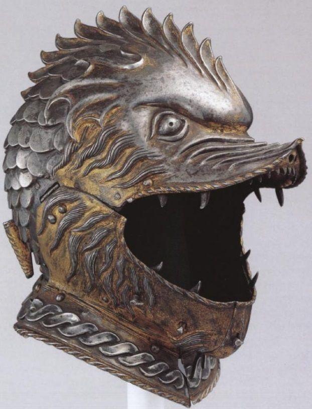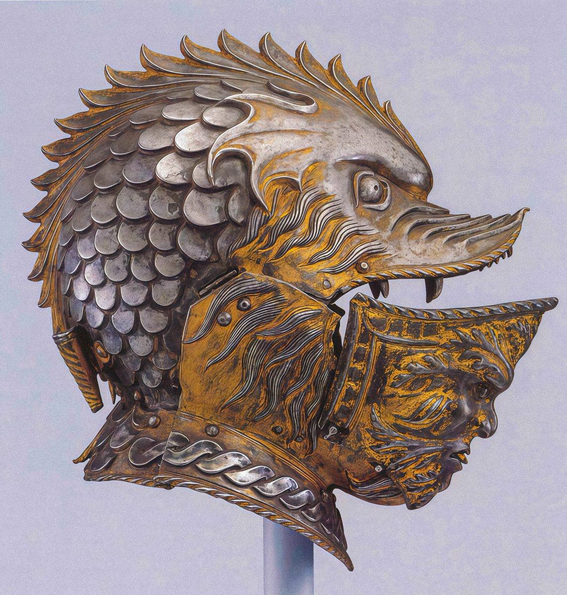 400年前的欧洲龙头金属头盔:看上去极其牛X,但是不能实战!这顶头盔是“米兰龙形头盔”(Milanese Dragon Burgonet),制作于 17 世纪,现藏于法国巴黎的陆军博物馆(Musée de l’Armée)。它出自意大利北部的米兰工坊——欧洲当时最负盛名的盔甲制造中心之一。这件头盔不仅是防具,更是艺术与象征权力的结晶,展示了意大利文艺复兴晚期金属工艺的巅峰。整件头盔采用钢与金的复合工艺打造,主体以精锻钢制成,并以鎏金与银镶装饰强化层次与质感。工匠通过极为细腻的錾刻、雕凿与浮雕技法,将头盔塑造成一条栩栩如生的巨龙形象——龙首在头顶张开,鳞片层叠,鬃毛如烈焰般向后翻卷,形成强烈的动势与威慑力。盔面下部则雕有一张人脸,似从龙口中浮现,寓意人兽合一的战斗化身。 这类头盔属于礼仪性盔甲,并非用于实战,而是贵族在加冕仪式、宫廷游行或骑士比武中佩戴的象征物。龙的形象在文艺复兴时期被赋予多重意义:它既象征力量与凶猛,也代表守护、智慧与权力的神圣化身。米兰工匠借此将佩戴者塑造成“龙之骑士”,展现其勇武与高贵血统。此外,头盔前部的面罩设计精妙,可翻开或拆卸,边缘饰以锯齿形金边,暗示龙牙与火焰。鳞片部分采用叠片铆接方式,使得结构既坚固又具装饰感。整体造型结合了解剖学的准确性与想象力的奔放,体现出17世纪意大利工匠在造型艺术与金属工程上的完美融合。 米兰在 16 至 17 世纪是欧洲盔甲制作的中心,其工坊为哈布斯堡家族、西班牙王室及法兰西贵族提供定制礼仪盔甲。其造型充满戏剧张力,与巴洛克时期对力量、运动与视觉冲击的追求高度契合。