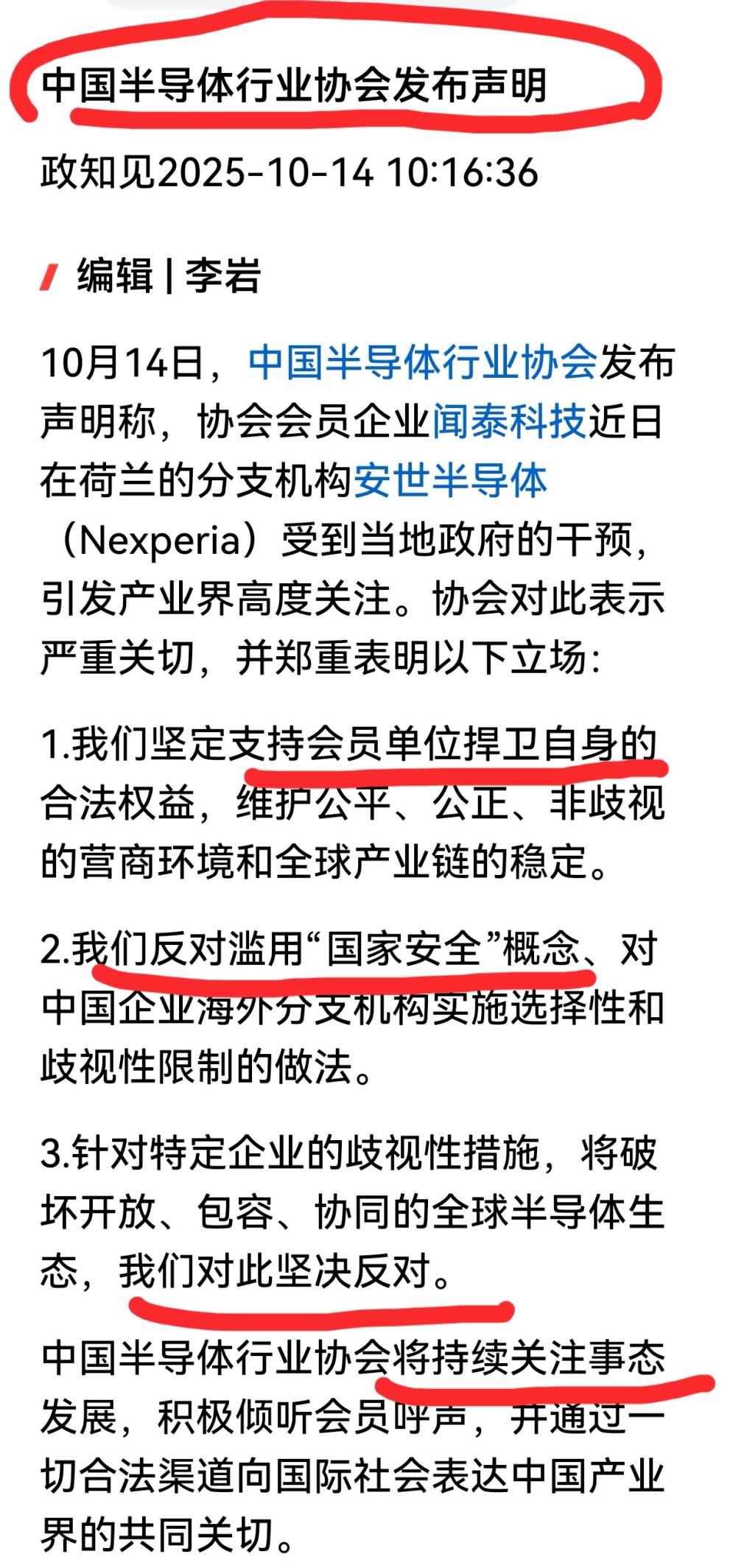 中国半导体行业协会在10月14日首先发声,对荷兰政府就安世半导体(Nexperia)公司采取的“歧视性”干预表示“严重关切”,这是中国有关方面做出的第一步反应,声明里有几个关键词:一是“坚定支持”会员单位捍卫自身的合法权益,二是“反对滥用国家安全概念”国家安全”概念,"选择性和歧视性限制"中国企业海外分支机构,三是“坚决反对”针对特定企业的歧视性措施,声明还表示将“持续关注事态发展”,将通过“一切合法渠道”向国际社会表达诉求。 安世半导体可不是凭空冒出来的小公司,它的老底子是荷兰皇家飞利浦的半导体业务,后来转给恩智浦,2017年被中国企业买下来独立成安世,2020年闻泰科技彻底收购它,成了自家核心业务。 这些年安世在荷兰老老实实地运营,在当地、德国、英国都有研发和制造中心,雇了几千个当地人上班,近五年给荷兰交了1.3亿欧元的企业所得税,相当于快10亿人民币了。 而且它做的芯片特别重要,汽车、工业、能源这些关键行业都离不开,是全球功率分离器件市占率第三的大厂,2024年光营收就有147亿多人民币,对闻泰科技来说更是顶梁柱,占了公司三成左右的收入。 可就在10月12号,荷兰政府突然下了命令,说安世对他们的“经济安全”有风险,把安世全球30个分支的资产、知识产权都冻结了,一年之内不能动,还不让闻泰派去的张学政当执行董事,等于直接插手公司管理。 更离谱的是,他们拿不出任何具体证据,就靠一句“国家安全”当理由,用的还是70多年前冷战时期的老法律,这种做法连英国BBC都觉得说不过去,直言没说明白到底有啥风险。 这时候中国半导体行业协会站出来发声,就是第一时间给会员企业撑腰。声明里说“坚定支持”会员单位维权,这话针对性特别强,因为闻泰科技就是协会的会员,现在被人无凭无据地欺负,协会肯定要表态。 安世这些年在荷兰合规经营,研发投入三年涨了150%,专利多了近千项,没半点违规记录,荷兰这种干预纯粹是没道理的打压,闻泰自己也说了这是地缘政治偏见,早就启动法律和外交途径抗议了,协会的支持就是给闻泰加码,让他们有底气跟荷兰掰扯。 然后说“反对滥用国家安全概念”,这更是点到了关键。这些年总有些国家拿“国家安全”当幌子,只要是中国企业收购的海外公司,不管经营得多好,说你有风险就有风险。 荷兰这次就是学了这一套,明明安世一直在给欧洲产业链做贡献,汽车厂都等着它的芯片,突然就被扣上“安全威胁”的帽子。 其实明眼人都看得出来,这跟美国9月份收紧对华限制有关,荷兰是跟着美国的节奏走,把正常的商业合作搞成了政治打压。 这种做法最坏的地方是破坏规矩,以后谁还敢去欧洲投资?明明说好的市场经济,结果说翻脸就翻脸,拿个模糊的安全理由就能抢企业控制权,这跟抢东西没啥区别。 再看“坚决反对歧视性措施”,荷兰这事就是典型的针对中国企业。安世是中国控股的公司就被这么折腾,要是其他国家的企业,肯定不会有这待遇。 彭博社都说了,欧洲几乎没有政府以安全为由接管中企海外子公司的先例,荷兰开了这个坏头,以后其他国家说不定也会学样。 而且半导体产业本来就是全球化的,芯片的设计、制造、封装要在好几个国家完成,荷兰这么一搞,等于在产业链上砍了一刀,不仅安世受影响,欧洲的汽车厂、电子厂说不定很快就会缺芯片,最后还是自己吃亏。 协会说要“通过一切合法渠道”表达诉求,这话不是空话。闻泰科技已经开始维权了,协会作为行业组织,能联合更多企业发声,还能向国际组织反映情况,让全世界都知道荷兰在搞歧视。 毕竟国际上讲究公平竞争,荷兰这种做法连法国智库都警告,说可能会引得其他国家效仿,破坏全球供应链。 其实荷兰自己也未必愿意这么干,他们国内的阿斯麦公司,四分之一的收入都来自中国,要是中国企业因为这事减少采购,阿斯麦的日子肯定不好过。 之前波兰就干过类似的蠢事,封了中欧班列的口岸想讨好西方,结果每天少赚两亿,还逼得中国开通了北极航线,自己啥好处没捞着。荷兰现在这么折腾,说不定最后也是自断财路,阿斯麦高管私下都在担心丢了中国市场。 更重要的是,这种打压反而会逼中国企业更努力搞自主研发。这些年国内光刻机关键部件的国产化率一直在涨,中科院也有新技术突破,荷兰越限制,咱们越要自己造。 就像以前别人卡我们的脖子,反而逼出了很多新技术,这次安世的事,说不定又能加速咱们半导体产业的进步。 所以中国半导体行业10月14号的发声,不只是为了安世这一家公司,更是为了所有中国企业在海外的合法权益。 既要告诉荷兰别太过分,也得让国际社会看清谁在破坏规则,同时给国内企业打气,不管遇到啥打压,都会有人撑腰,而且咱们自己的技术硬了才是真的硬。