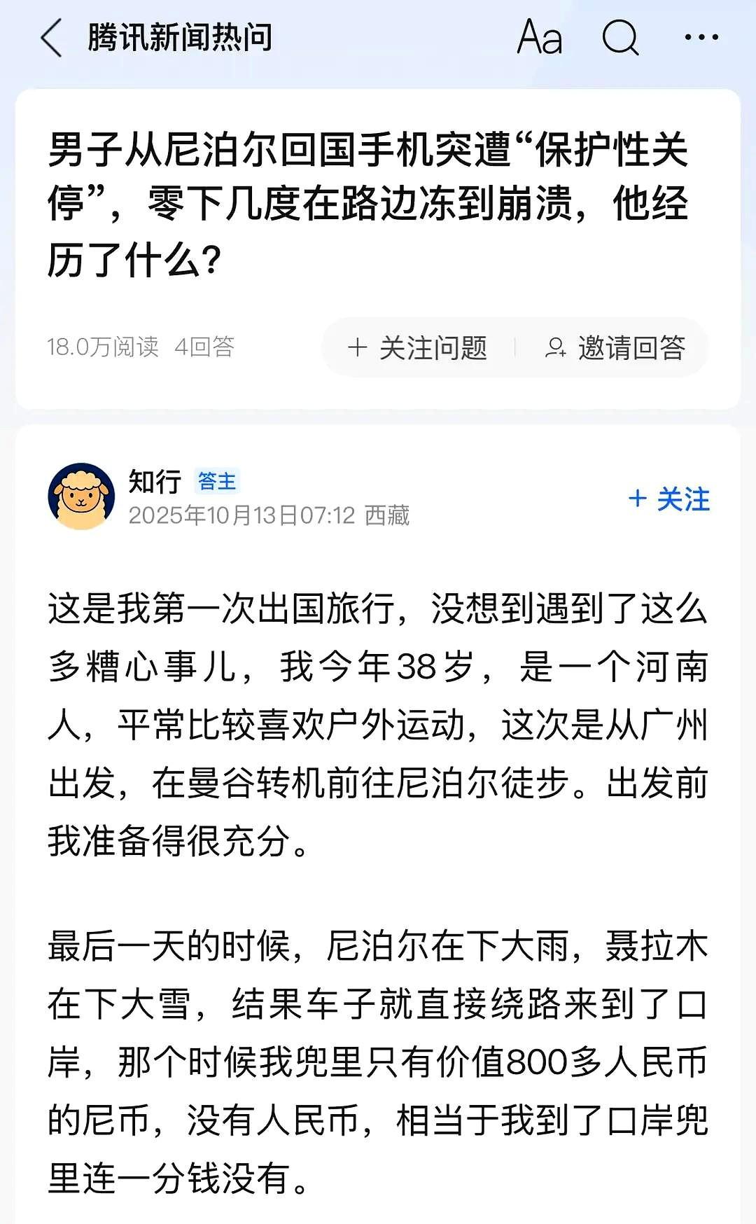 西藏,38岁男子李先生从尼泊尔回国,手机被停机。 他以为欠费,充值后仍无法开机,移动客服告知是“保护性关停”,需回新疆办理实名认证。 男子在零下几度冻到崩溃,决定起诉移动。 事件反映运营商“一刀切”缺乏人性化。 网友对此表达观点: 我也经历过,简直崩溃到怀疑人生,乱搞一通,我不欠你的电话费,凭啥想停机就停机,谁给的权利,老百姓的权益在哪里,不要以任何借口行流氓做法,法制社会需要方方面面 我的天,聂拉木到日喀则是500多公里吧,坐数量不多的班车差不多得一天时间啊…… 这么个整法很伤人啊…… 支持中国移动,出国之前就应该知道,明明在尼泊尔买一个电话卡就行。 电信运营商为什么不从根本是截获诈骗电话,而要“保护”消费者--停机呢?