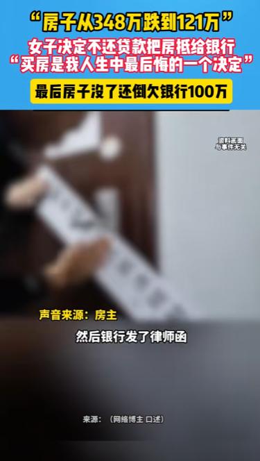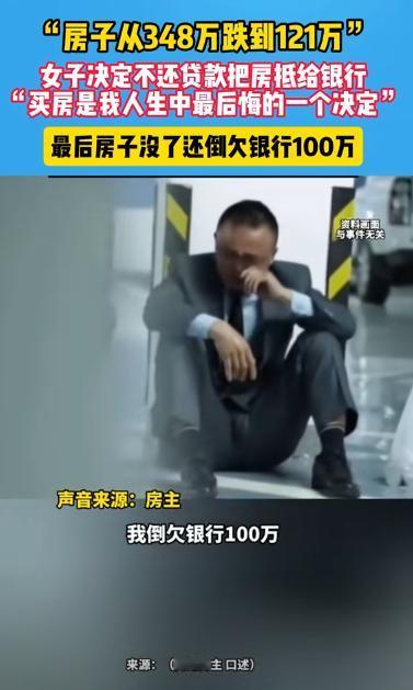 不要盲目跟风!6月13日报道,河南女子348万买的房子跌到121万。她决定不还贷款了,打算直接让银行把房子收回去,结果银行核算所有费用后,告知她还倒欠100万!她原本以为买房子可以增值,至少能够保值,结果贷款没还完,还直接负债了。 “买房是我人生中最后悔的决定”,来自一位女士的呐喊! 据河南公共频道报道,王女士(化名)干了几年活之后,手里面也有了一些积蓄,于是她就想着要买一个房子没一个属于自己的小家,这样的话下班之后就会比较轻松自在。 随后她就去很多售楼处到处看房,看了很多之后她相中了一套价值300多元的房子,那时候的房价正是最贵的时候,身边的朋友都劝王女士让他缓一段时间再买。但王女士的心已经到这儿了,谁也阻止不了,立马就付了首付。 买过房之后,她每个月的工资一部分出于房贷,另一部分用于她的生活,过得美滋滋的。但没过几年房价就出现了大跌的情况,她的房子现在只值一百二十一万元,看到房子跌了这么多,王女士心里面很不甘。 但令她更没有想到的是她每个月的工资也受大环境的影响减少了不少,所以现在一边要维持生计,一边还要房贷,压的她根本都喘不过气。 所以这时候王女士就想着自己的房子,现在值100多万想把房子直接抵押给银行让银行收回这样的话,现在值的价钱和剩下没还完的贷款正好相抵消,不料事情并没有她想象中的那么好。 等王女士到银行之后,银行的工作人员向王女士解释说,如果现在要把房子收回的话,王宇是就属于违约行为,不仅会被告上法庭,而且所有的诉讼费用全部都由她来承担,这样综合算下来还要再倒贴给银行一百万。 面对这样的事情,王女士就将它发到了的视频平台上面,很多网友看到之后才下面发表自己的看法。有一些网友在下面说,他也是买了一套三百多万的房子,本想着能够倒手挣个差价,不料现在一百万万也卖不出去。 还有一些网友在下面调侃说,他自己现在没有车没有房也没有存款,觉得王女士最亲的最后还落了一套房子,也挺值的,最起码没有都将钱挥霍掉。 那么通过这件事情也告诉我们在做一项决策之前要综合考虑多方面因素,不要只看眼前的一方面就决定。 对此,你还有什么看法吗? (信息来源 :河南公共频道 2025-06-13)