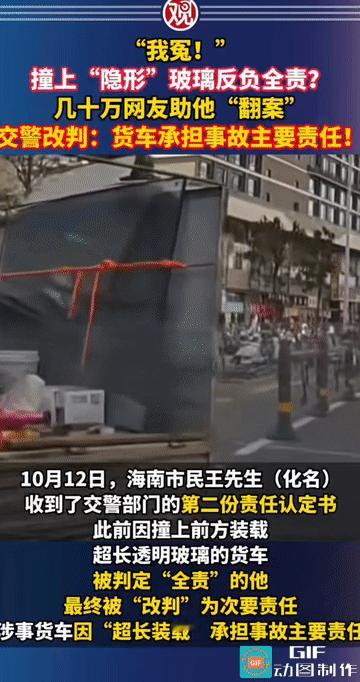 “几十万网友化身‘正义判官’!”海南,一男子驾车缓缓接近前方正准备左转的轻型货车,他观察后减速,从距离货车车身约半米处通行。突然,一声巨响,他的车前挡风玻璃和发动机盖受损——直到碰撞发生,他才看到那块完全透明的超长玻璃! 事故发生后,男子被判全责。他不服将行车记录仪视频发上网,近30万网友围观讨论,舆论哗然! 来源:【观察者网】 此事件发生在10月8日上午11时左右,海南海口南海大道龙湖天街入口前。王先生(化名)计划驾车前往商场购物用餐,恰逢前方一辆轻型货车正准备左转进入停车场! “我当时观察货车准备左转已经减速,从距货车车身约半米处通行”,王先生回忆道,直至发生碰撞他才发现货车载有一块透明玻璃! 事发时正值中午时分,太阳光线特别强烈。王先生的车处于光线较暗处,而货车司机仅在玻璃右上角悬挂了一块抹布作为警示! “货车司机设置的‘警示物’完全被背景淹没,根本无法观察到。”王先生称。 事故发生后,王先生立即拍照报警。同日,海口交警部门出具了道路交通事故认定书,认定王先生违反了《道路交通安全法》第二十二条第一款有关安全驾驶、文明驾驶的规定,负全部认定书显示,王先生需承担双方车辆的全部损失! 据王先生介绍,事故造成涉事货车两块玻璃受损,货车司机声称损失约1200元。 而王先生车辆的前挡风玻璃、发动机盖受损,经与保险公司及4S店沟通,初步估算维修费用超过万元。 损失金额的悬殊让王先生对全责认定更加无法接受。他认为,货车司机载有超长玻璃,加上其悬挂的警示标志不明显,才导致了这起事故,不应该是自己全责! 王先生表示,货车尾部装载的透明玻璃明显超出车身长度,而那块几乎看不见的抹布根本无法起到有效的警示作用! 透明玻璃在强光下几乎隐形,加上不明显的警示标志,构成了一个“隐形障碍”! 为还原事实真相,10月10日上午,王先生将行车记录仪视频上传至社交平台。没想到视频传播速度远超预期,当天浏览量便接近20万。 随着视频不断传播,总浏览量接近30万,引发了广大网友的激烈讨论。 在视频下方,绝大多数网友替王先生愤愤不平,认为“责任应该在货车方”。有网友指出,“超长装载、遮挡牌照、不打转向灯本就违规,透明玻璃加不明显警示标志,简直是‘隐形障碍’”! 还有网友担忧道,“幸好是机动车撞上,若换成电动车,恐怕会造成更严重伤亡”! 网友的关注不仅为王先生提供了声援,也引起了交警部门的重视。10月10日晚,海口交警部门主动联系王先生,告知他可以申请复核,也可以在10月12日前往交警大队重新定责! 10月12日上午,王先生委托朋友前往交警大队。交警部门结合视频证据,核实事故情况,并依据相关法规对事故责任作出了重新认定。 交警部门认为,货车司机的行为违反了《中华人民共和国道路交通安全法》第四十八条第一款“机动车载物应当符合核定的载质量,严禁超载;载物的长、宽、高不得违反装载要求,不得遗洒、飘散载运物”之规定。 货车司机因“超长装载”负事故主要责任。王先生负事故次要责任。 对于这一“改判”结果,王先生坦言“心里仍觉得委屈,始终认为自己尽到了相应的责任”。起初,他因“走复核流程会耗费大量时间精力”,曾想不再继续追究! 但不少网友留言建议他“继续复核——这不仅是为自己维权,更能助力交通法规完善,推动执法部门加大对违规装载行为的打击力度”!