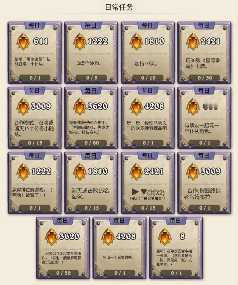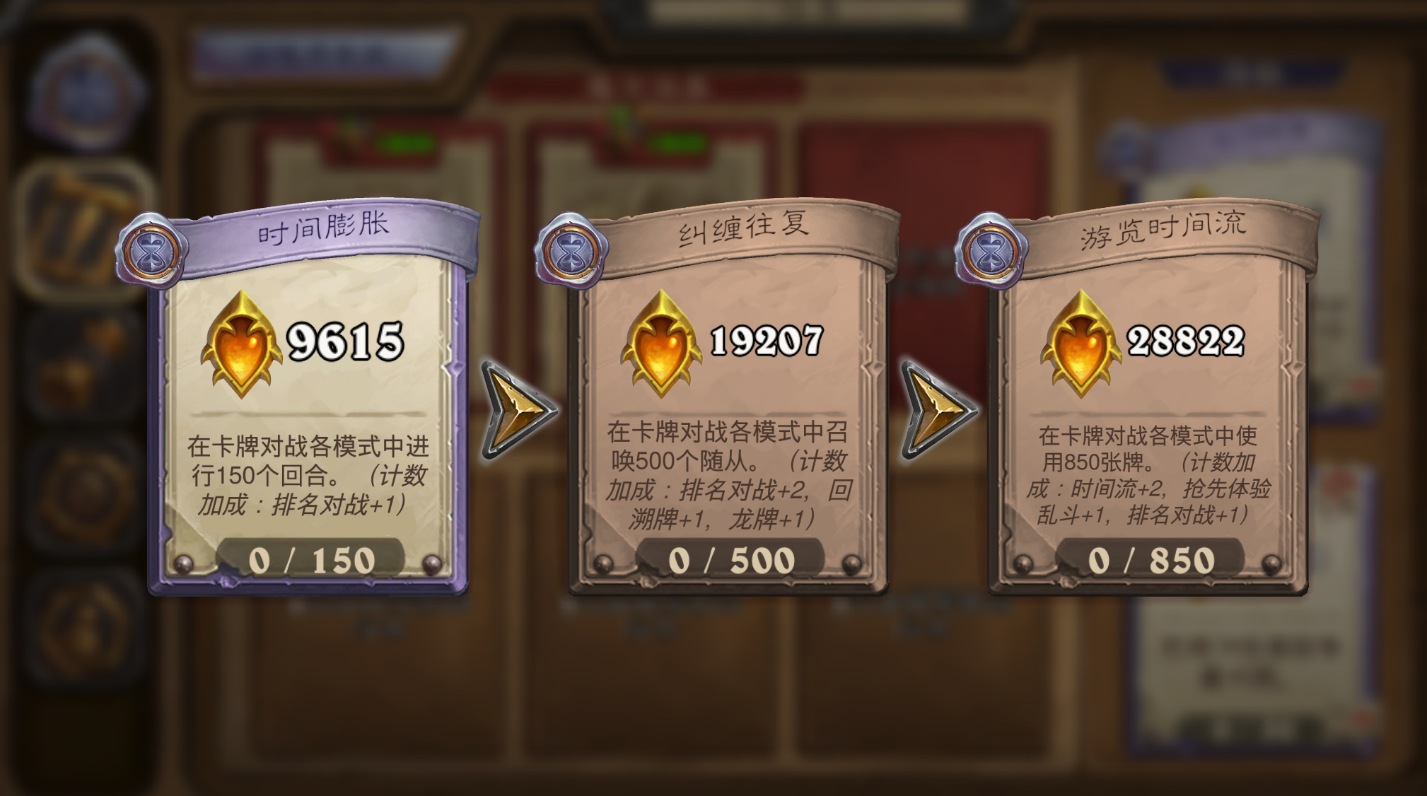 炉石传说 新活动克罗米的时空危机,共可领取2蓝2紫4金蓝2金紫4卡包两通票和一款皮肤,每日任务经验的差距比较明显,可以刷新,不过其中经验8的每日任务,虽然经验少,但是会实打实的给一个卡包。