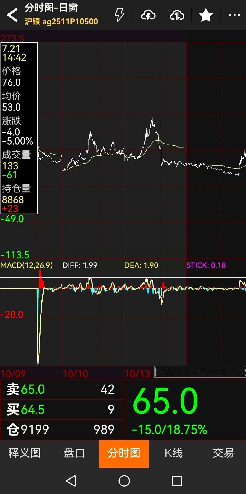 赚一百万需要多长时间? 一天足矣。 比如今天,2025年10月14日,上午11点26分,买入白银看跌期权,成交价36,买50万;下午14点42分,平仓,价格76。 这一天之间,就翻了一倍。 网友对此表达观点: 错[灵光一闪]本金 50 万,再赚 50 万[灵光一闪]需要多长时间[捂脸]一天。 少见多怪,期权翻倍司空见惯,五六倍十几倍的也不稀罕,只是抓住并不容易 鬼才相信你,你能50万全部在36成交???????你50万一把进场价格早飞起来啦!!!!!! 大乐透开奖啦,时间今天立马倒回到彩票封停之前买一注,坐等开奖