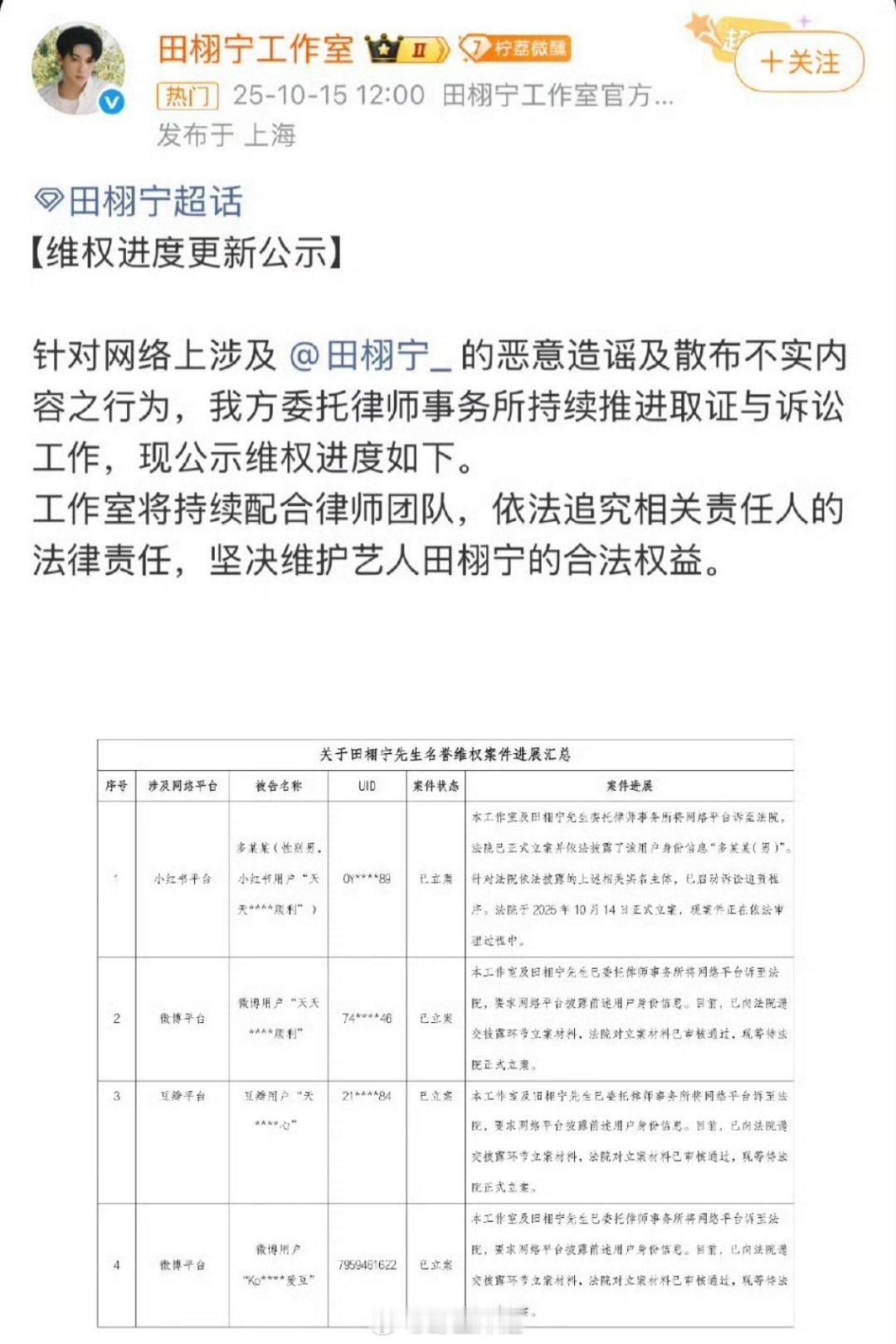 田栩宁工作室更新维权进度