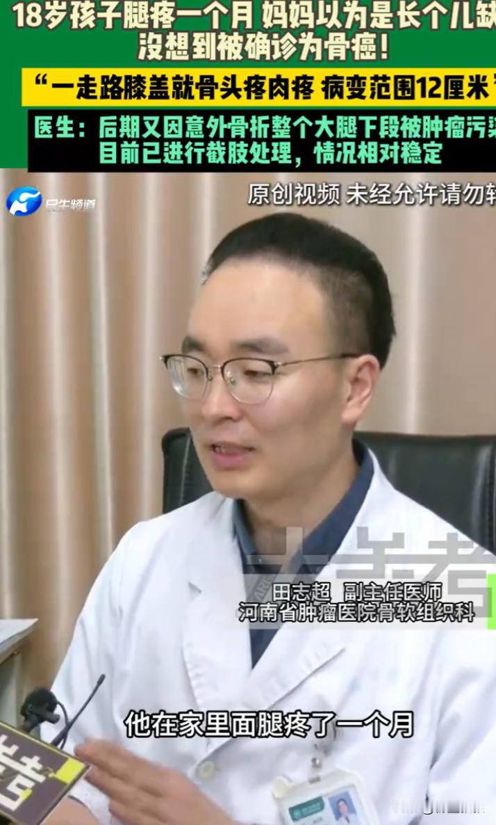 “万万没想到!”河南郑州,一位18岁高中生腿疼,妈妈没在意,还以为是孩子缺钙了,可后来孩子的情况越来越严重,就连走路都肉疼,去医院一检查,被确诊为骨癌,病变范围12厘米,最后只能截肢处理。 咱当妈的都知道孩子到了十八九岁,虽说不算还在猛蹿个儿的年纪,但高三那阵子学习压力大、久坐不动,偶尔喊两句腿疼,多数人第一反应都是 “是不是缺钙了? 是不是累着了?” 可河南郑州这位妈妈,却因为这个 “想当然”,把自己 18 岁的儿子坑惨了,万万没想到,就一句 “膝盖疼”,最后竟要截肢,现在想起来心都还揪得慌。 这孩子叫小宇,今年 18正读高三,每天天不亮就出门,晚上快十一点才拖着书包回家,一天下来除了吃饭、上厕所,基本都坐在书桌前刷题。 大概是一个月前,小宇放学回来,换鞋的时候突然扶着墙,皱着眉说 “妈,我膝盖有点疼,说不上来是骨头疼还是肉疼,就是不得劲”。 当时小宇妈妈也没往坏处想,一边帮他拿拖鞋,一边说 “肯定是缺钙了,你这阵子坐太久,也没咋运动骨头没力气,明天我去买大骨头,给你炖点汤补补,再买瓶钙片吃几天就好了”,小宇也没反驳,点了点头就回房间写作业了。 接下来的日子小宇妈妈每天都炖排骨汤,钙片也按时提醒他吃,一开始小宇还说 “好像没那么疼了”,可过了四五天他的腿疼反而加重了。 早上出门的时候,看见他走路有点一瘸一拐的,问他咋回事,他说 “晚上疼得睡不着,翻个身都疼,白天走路的时候,感觉膝盖那一片的肉都在疼,像有根针在扎”。 小宇妈妈当时心里有点犯嘀咕,但还是觉得 “可能是补得还不够,再等等看”,毕竟 “生长痛”“缺钙疼” 这些词,早就刻在咱当妈的脑子里了,谁能想到会是癌症呢? 又过了一周小宇的情况更糟了,有天晚上他疼得直冒冷汗,从房间里走出来,扶着门框跟我说 “妈,我实在疼得受不了了,腿都不敢弯”。 这时候小宇妈妈才彻底慌了,赶紧给孩子爸说,让他第二天别上班了,一起带小宇去医院,第二天一早,我们就去了郑州的一家三甲医院,挂了骨科的号,医生先问了小宇的情况,又让他拍了 X 光片还做了 CT。 等结果的时候,小宇妈妈还在跟孩子爸说 “应该就是滑膜炎之类的,开点药让他歇几天就好了”。可没等多久,医生拿着片子走过来,脸色特别严肃让我们去办公室谈。 一进办公室,医生就说 “孩子膝盖周围长了个肿瘤,初步判断是骨肉瘤,也就是咱们常说的骨癌,从片子上看病变范围大概有 12 厘米,已经侵犯到周围的肌肉组织了”。 我当时听完,脑子 “嗡” 的一声,眼泪一下子就下来了,抓着医生的手问 “不可能啊医生,他就是腿疼,怎么会是癌症?是不是查错了?” 医生叹了口气,说 “我们再安排个病理检查确认一下,但可能性很大,你们要是早点带孩子来就好了,现在肿瘤已经有点大了”。 病理检查结果出来确诊是骨肉瘤,医生跟我们说 “现在有两个方案,一个是尝试保肢治疗,但风险很大,肿瘤扩散的可能性高,另一个是截肢从膝盖下方一点截掉,这样能最大程度避免癌细胞扩散,保住孩子的命”。 小宇妈妈和孩子爸抱着哭了好久,小宇知道结果后也沉默了很久,最后跟我们说 “妈,我想活着,我还想高考,截肢就截肢吧”,没办法只能同意医生的方案,给小宇做了截肢手术。 现在小宇在家养伤,看着他坐在轮椅上,明明才 18 岁却没了一条腿,小宇妈妈就后悔得不行,要是当初他第一次喊疼的时候,不那么 “想当然”,要是早点带他去医院检查,是不是就不会走到这一步? 后来跟医生聊,才知道骨肉瘤专找青少年,尤其是长得快、爱运动的孩子,而且它的疼跟普通的缺钙疼不一样,普通腿疼可能是偶尔疼、肌肉疼,而骨肉瘤的疼是持续的,晚上比白天疼得厉害,吃普通的止痛药也不管用。 (信息来源:河南民生频道)