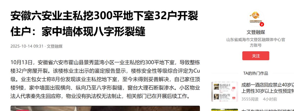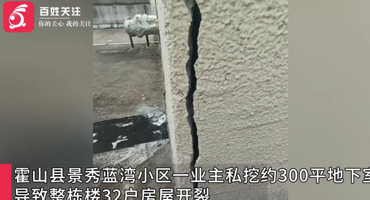 “这下闯大祸了!”安徽六安,家住9楼的女子突然发现自己家中墙体开裂,而且是有横向、纵向乃至八字形裂缝,原来,是楼下业主背着其他业主和物业私挖了一个300平地下室。整栋楼32户都受到了影响。 安徽六安景秀蓝湾小区的业主们,最近真是被一件事吓得心都悬在嗓子眼,这下闯大祸了!住在 9 楼的包女士,前阵子在家收拾屋子,擦客厅墙的时候,手刚碰到墙皮,就 “哗啦” 掉下来一小块灰。 她当时还纳闷自家装修没几年,墙怎么就掉皮了?凑过去仔细一看,后背瞬间冒了冷汗,墙面上居然裂了好几道缝,有的是横着的,像被人用尺子画了一道线,有的是竖着的,从天花板一直裂到踢脚线;更吓人的是还有几道 “八字形” 的裂缝,交叉着爬在墙上,看着就跟那墙随时要塌似的。 她赶紧去各个房间看,卧室、厨房、阳台,就没找到一块没裂的墙,就连窗台的大理石台面,也从中间裂了道缝,下雨天还往屋里渗水,窗台上摆的花盆都被渗的水弄湿了。 包女士当时就慌了,赶紧给对门邻居打电话,结果邻居一开口就说:“哎呀,我家也这样!昨天我儿子在墙上贴画,才发现墙裂了还以为就我们家呢!” 这下大家才意识到不对劲,楼里的业主们建了个微信群,你一言我一语地说,最后统计下来,整栋楼 32 户人家,几乎家家都有墙体开裂的情况,只不过有的裂得轻,有的裂得重。 有人说自家卫生间瓷砖都翘起来了,有人说阳台的护栏晃着都有点松,大家越说越害怕:好好的楼,怎么突然到处裂?不会是楼要塌了吧? 业主们一起去找物业,物业也一头雾水,说没接到过施工通知,也没听说楼体有什么问题,后来有个住在 2 楼的业主说,最近总听见楼下 1 楼那户人家,白天有隐隐约约的 “咚咚” 声,像是在挖东西,晚上还能看见有卡车偷偷摸摸地拉渣土,门口还用三米多高的铁皮围栏围得严严实实,根本看不见里面在干嘛。 大家这才把怀疑的目光放在了 1 楼的黄某某家,一群人凑到他家围栏外听,果然能听见里面有机械作业的声音,物业赶紧联系黄某某,让他开门可对方支支吾吾半天不肯。 最后没办法业主们报了警,警察来了之后,黄某某才不情不愿地打开了围栏,这一打开,所有人都惊呆了,他家院子里根本不是什么装修,而是挖了一个巨大的地下室! 后来专业人员来测量,这个地下室足足有 300 平方米,往下挖了快 4 米深,原本应该支撑整栋楼的地基,被挖得乱七八糟,承台下的岩石被凿得碎碎的,有的地方混凝土都破了,里面的钢筋直接露在外面,看着就触目惊心。 检测机构的人来看了之后说,这楼的地基已经不安全了,属于 “Cu 级”,简单说就是地基出了明显问题,整栋楼的结构都受了影响,再这么下去真有可能出大事故。 黄某某这才承认,他是觉得自家空间小,想偷偷挖个地下室放东西,也没跟物业报备,更没跟其他业主说,想着白天用小挖掘机慢慢挖动静小,晚上再把渣土运走,神不知鬼不觉的,没想到把整栋楼的地基都给破坏了。 现在整栋楼的业主都人心惶惶,有的不敢在家住,只能去亲戚家借宿,有的虽然还住着,晚上睡觉都能听见墙 “咯吱” 响,根本睡不踏实,一开始黄某某给每户每天发 150 块钱临时安置费,可才发了 10 天就停了。 业主们去找乡镇政府,人家说不满意就走法律程序,找信访部门也只是含糊地说 “真有问题会处理”,皮球踢来踢去,个准信。 32 户人家本来住得好好的,就因为黄某某一个人的自私,把好好的家变成了 “危楼”,现在大家路过 1 楼那围栏,都忍不住叹气 ,这哪是挖地下室啊,这是把大家的安全感都给挖没了! (信息来源:文登融媒——安徽六安业主私挖300平地下室32户开裂 住户:家中墙体现八字形裂缝)