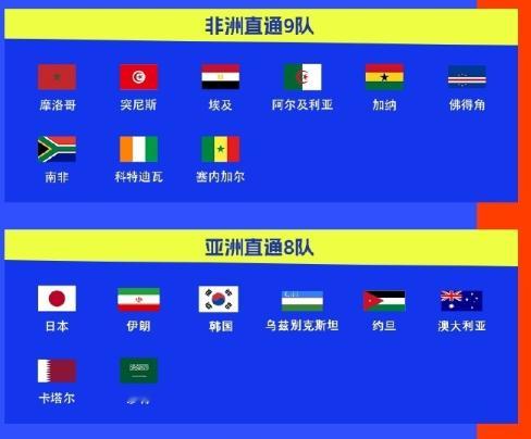 美国、墨西哥、加拿大、日本、新西兰、伊朗、阿根廷、乌兹别克斯坦、韩国、约旦、澳大利亚、巴西、厄瓜多尔、乌拉圭、巴拉圭、哥伦比亚、摩洛哥、突尼斯、埃及、阿尔及利亚、加纳、佛得角、南非、卡塔尔、英格兰、沙特、科特迪瓦、塞内加尔。